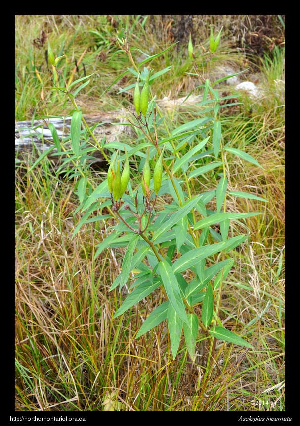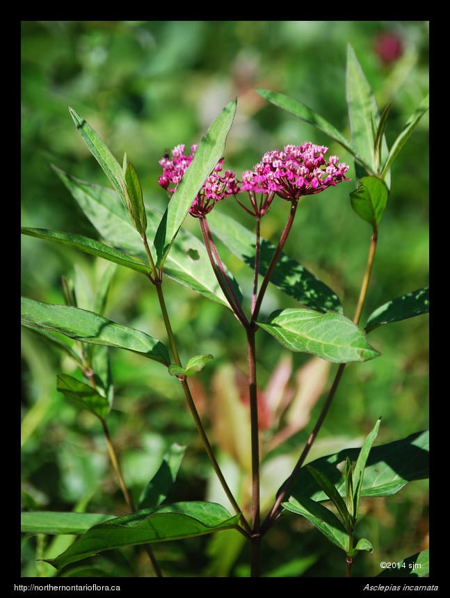 Similar Species: The only other milkweed species well-distributed in northeastern Ontario is the common milkweed (Asclepias syriaca L.), which is easily distinguished by its larger stiff oblong leaves and lighter pink to purplish flowers. Common milkweed is found in drier, usually disturbed, habitats, such as fallow fields, railway rights-of-way, and roadsides.