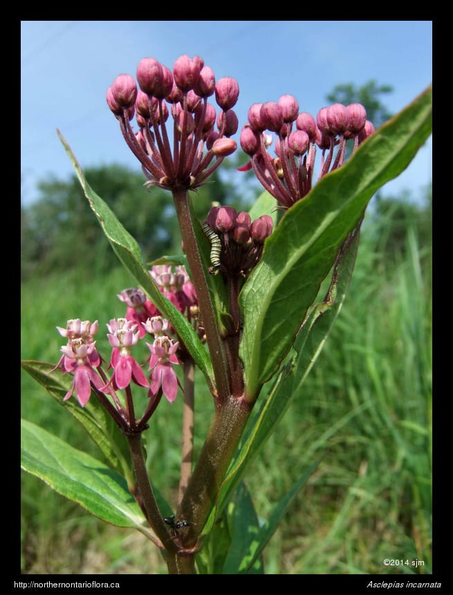 Click on a thumbnail below to see larger image.General: An erect perennial herb, 1—1.5 m tall, arising from a deep taproot. Mature plants produce several erect shoots from the base. Warning: All parts of the plant have a milky-white sap that contains poisonous glycosides. The bitter sap deters most insect predators, but monarch caterpillars are apparently immune and feed exclusively on milkweed plants, retaining the poisonous qualities of the sticky white sap as adult monarchs, making them unpalatable to predators. Swamp milkweed, planted in wet areas of rights-of-way, provides egg-laying sites for monarch butterflies and food for their larvae.