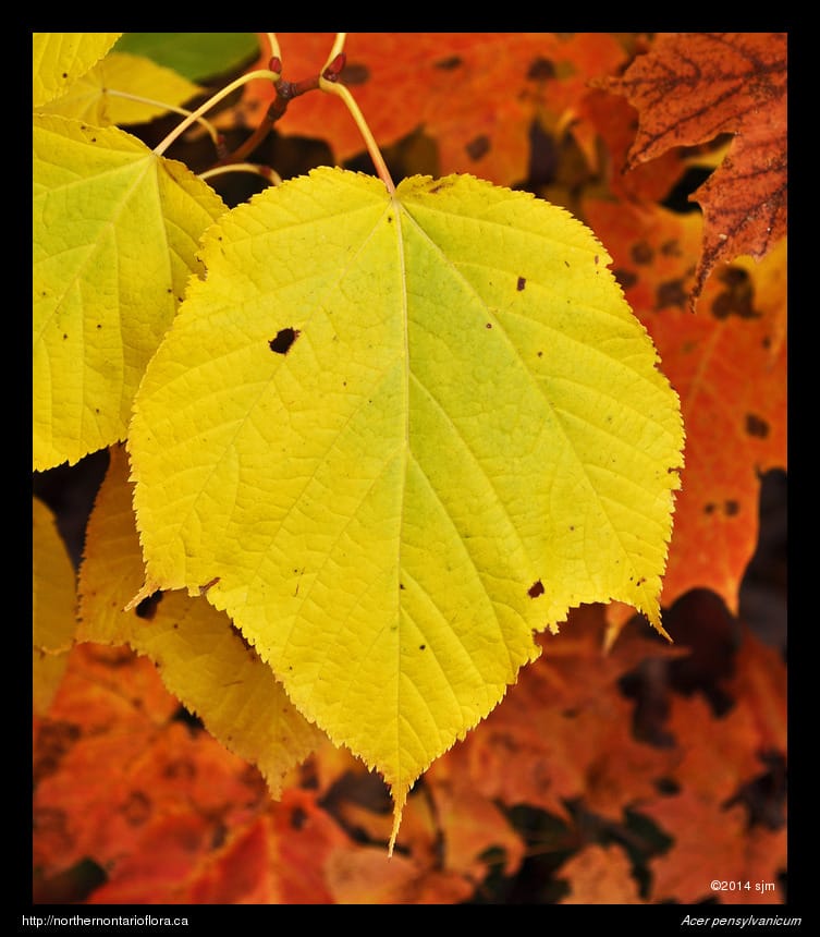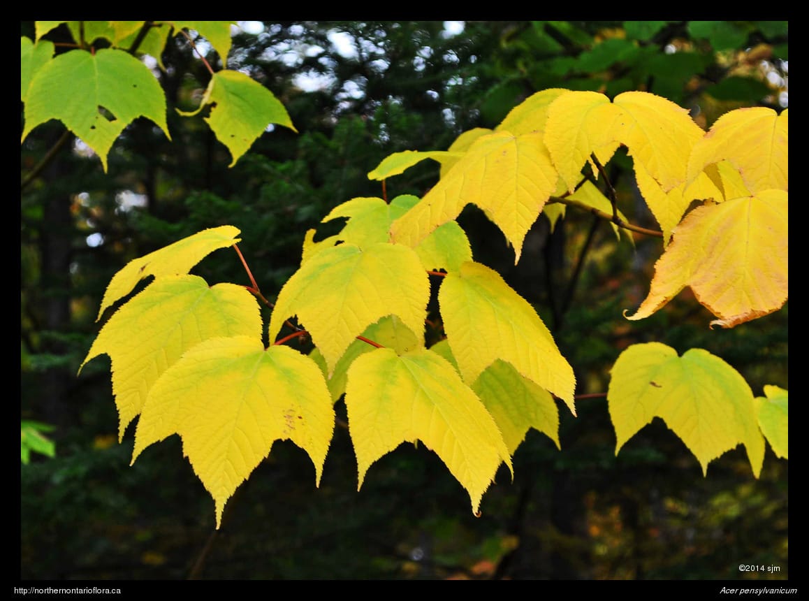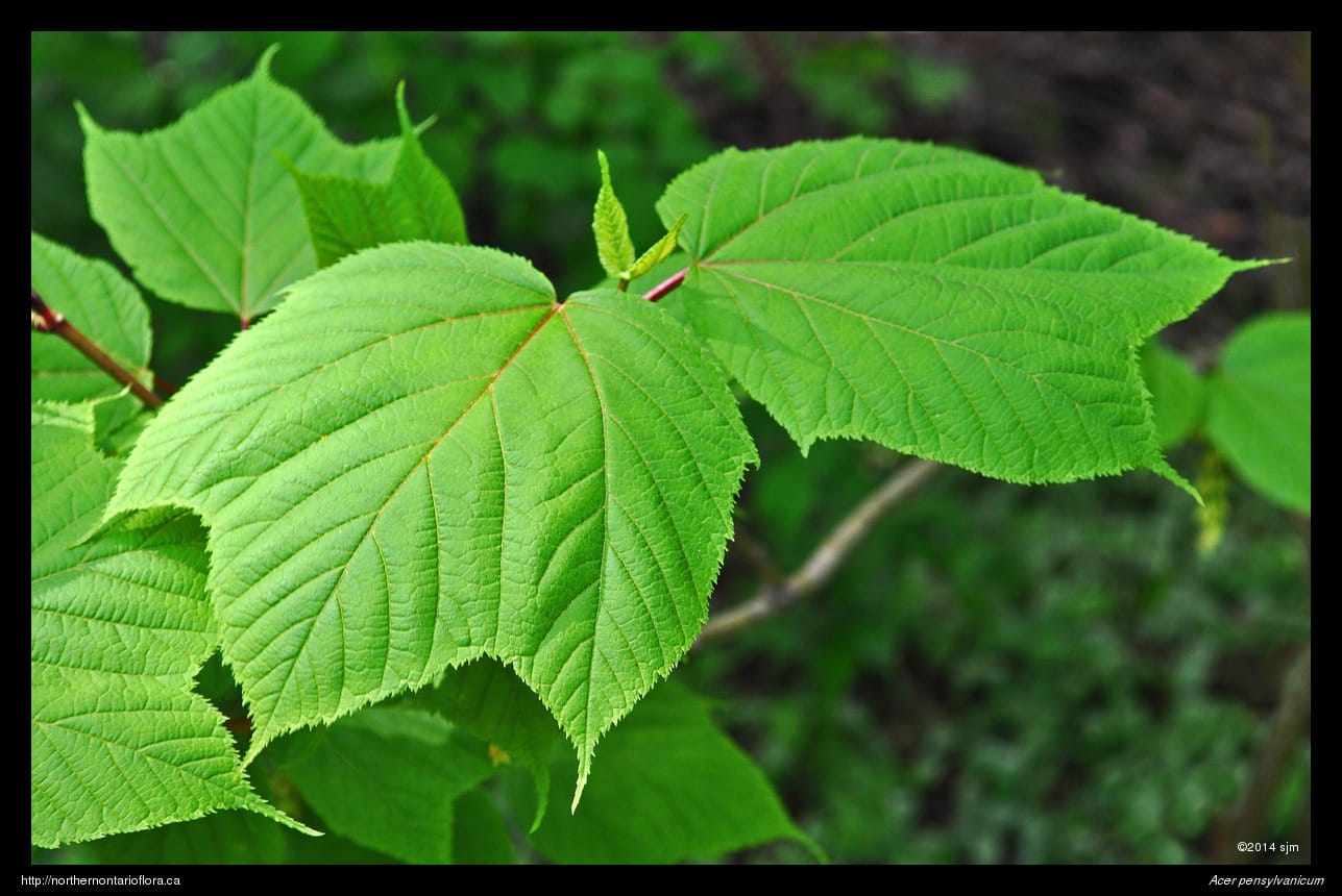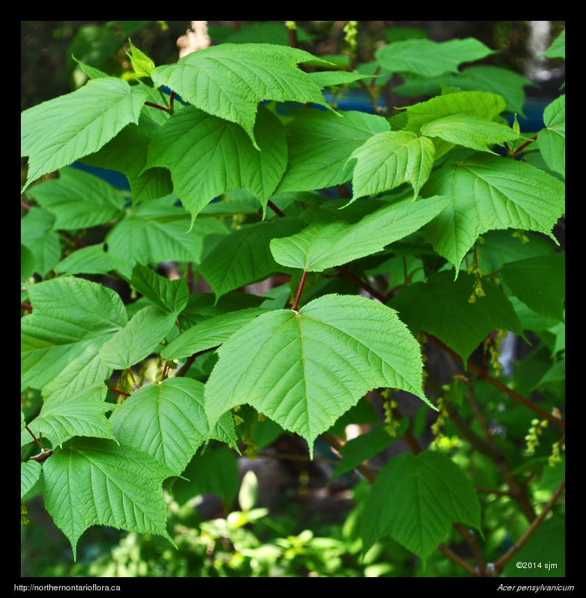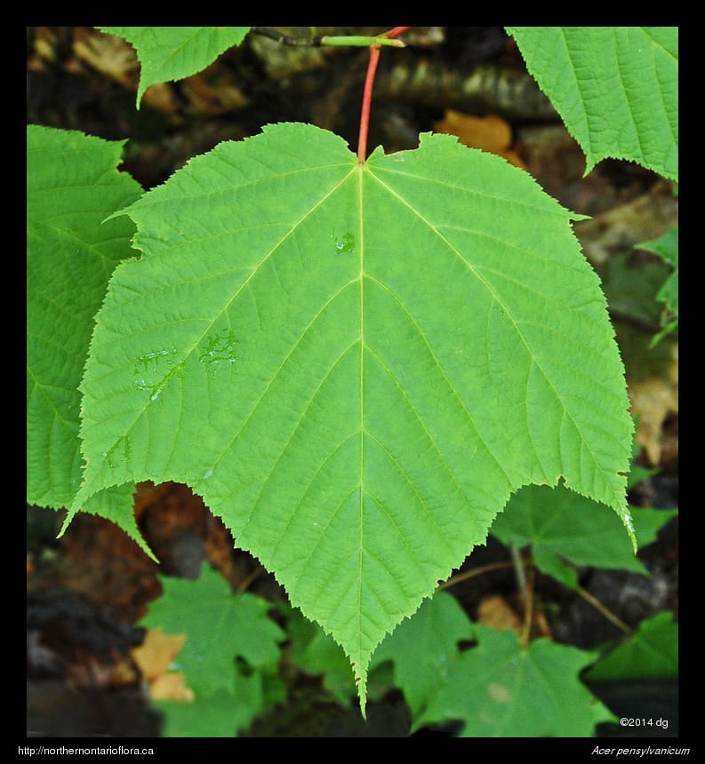 Leaves: opposite, simple, palmately veined, petiolate. Leaf blade broad, with 3 prominent, triangular lobes toward the apex, occasional leaves may have smaller lobes toward the base; 1-2 dm long, nearly as wide as long; green above, paler beneath, glabrous; base rounded to slightly cordate; the 3 terminal lobes ending in long-pointed (acuminate) apices; margins double-serrate, with sharp teeth; petiole 2.5–8 cm long. Leaves turn bright yellow in fall.