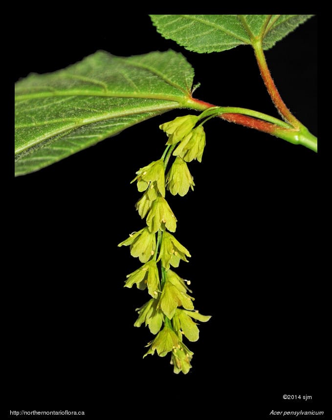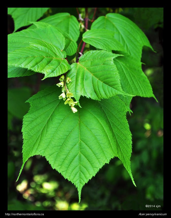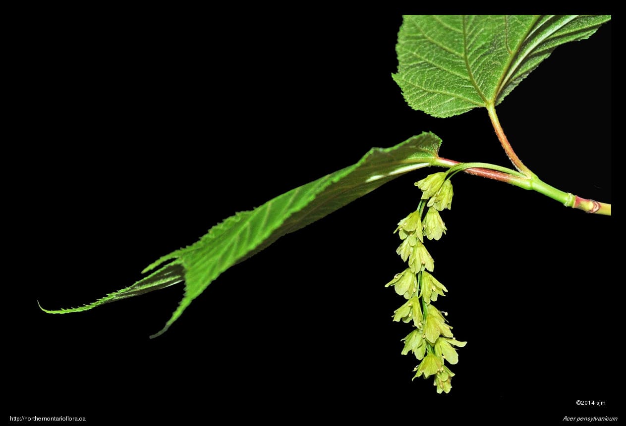 Acer spicatum (mountain maple) is most similar to Acer pensylvanicum, but has coarser-textured leaves with 3 main terminal lobes, sometimes with 2 smaller basal lobes. It's buds are pubescent and the raceme is erect, rather than nodding, as in Acer pensylvanicum. See also the borealforest.org webpages on Acer spicatum (mountain maple).