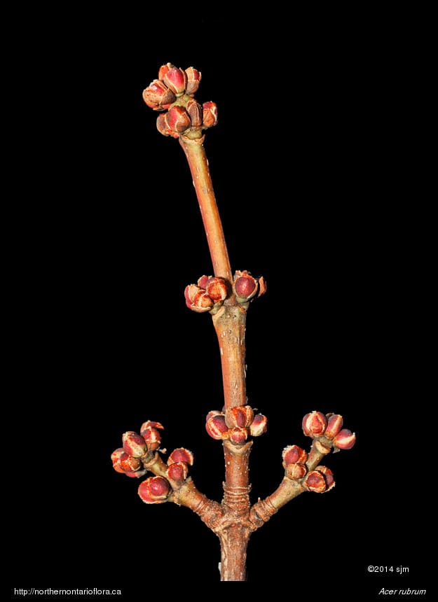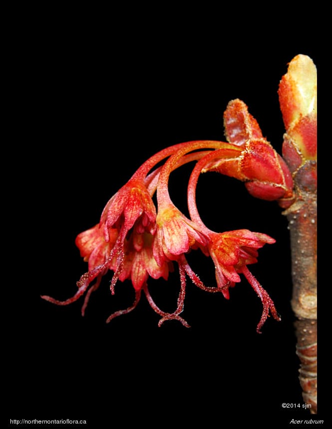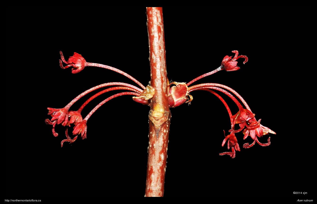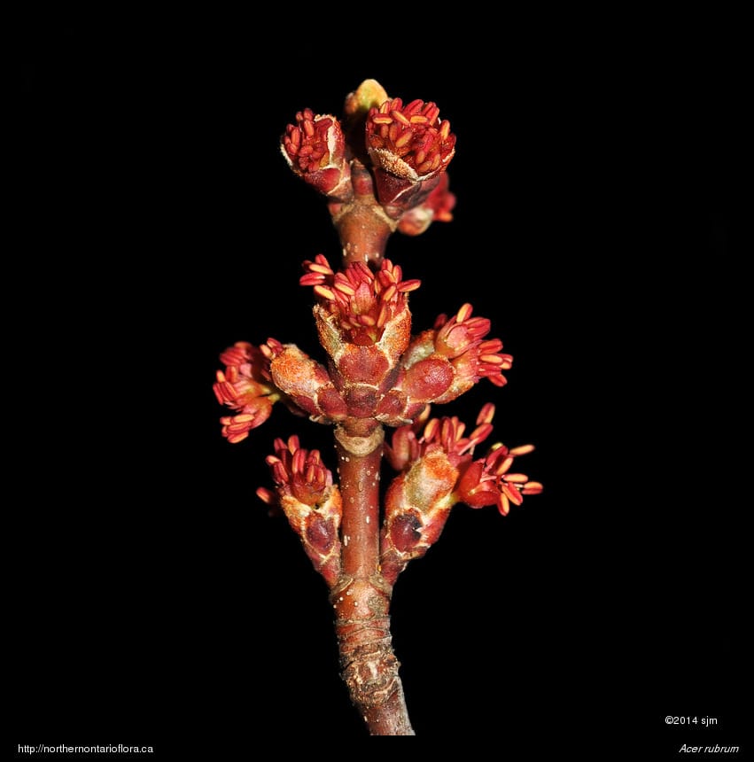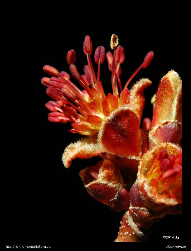 Flowers: Red, in sessile clusters of bisexual and male flowers on some plants, bisexual and female flowers on other plants (polygamodioecious), appearing before the leaves; calyx 5-lobed, red; petals 5, red, linear-oblong, pubescent; stamens 4-12 (often 8); ovary superior, glabrous, 2-carpelled, styles 2. Flowering April to May.