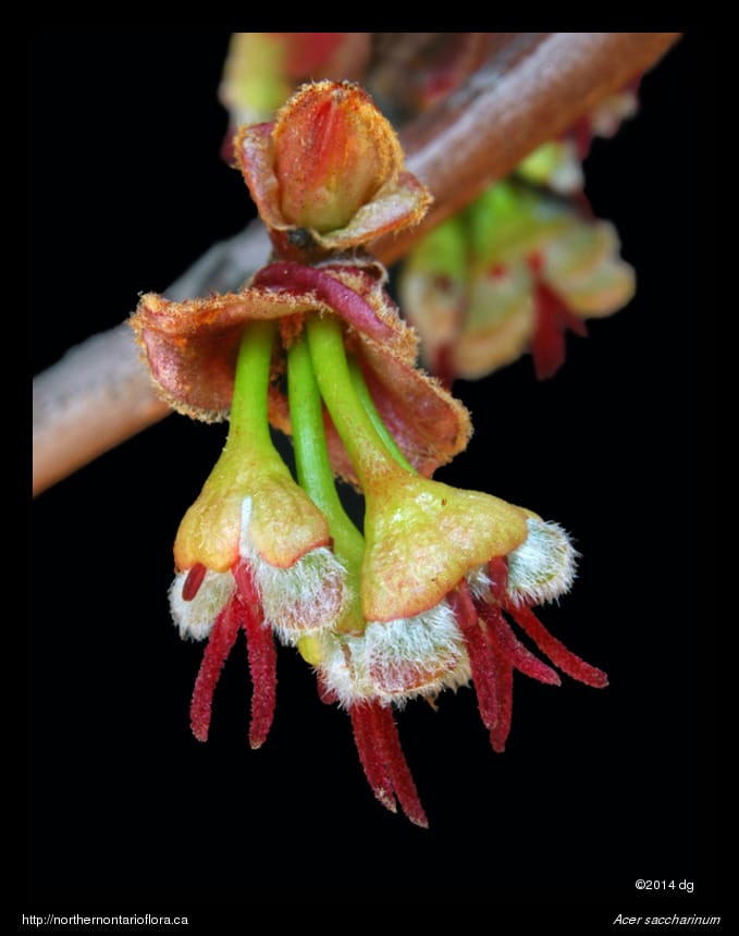 Flowers: greenish-yellow to red, arranged in dense clusters, openning before the leaves. Petals lacking, ovary and base of fruit pubescent.