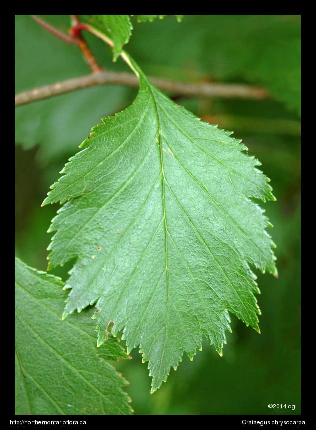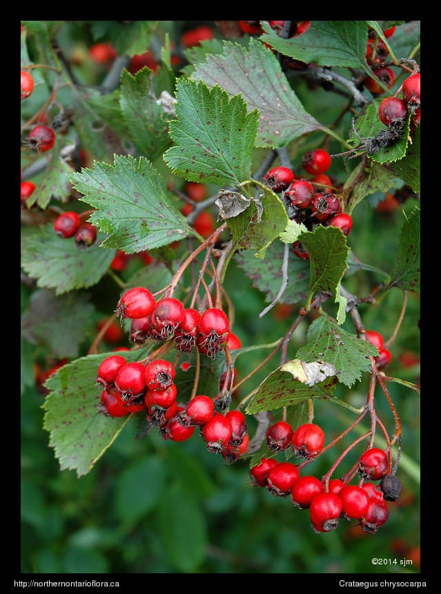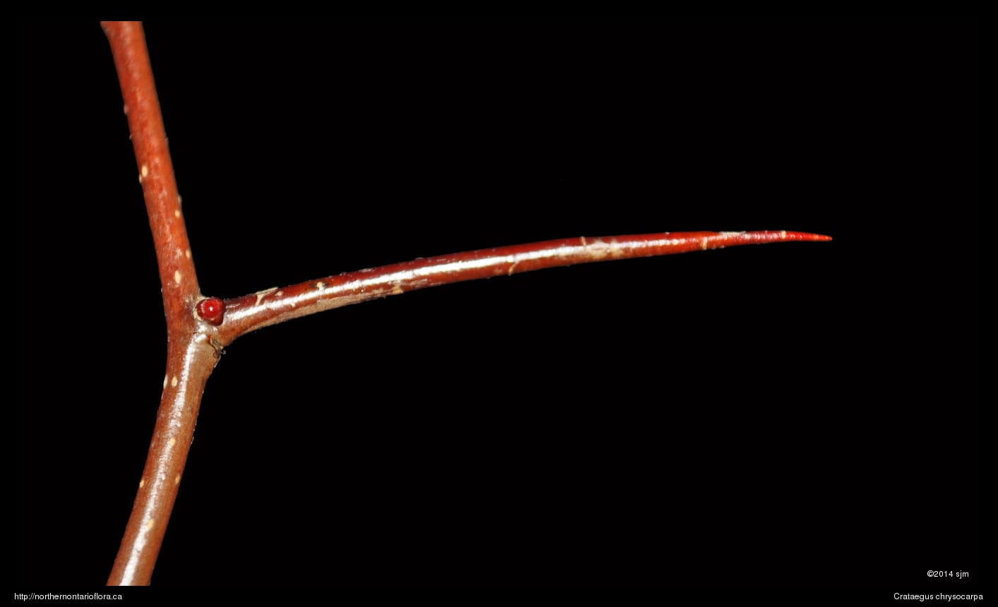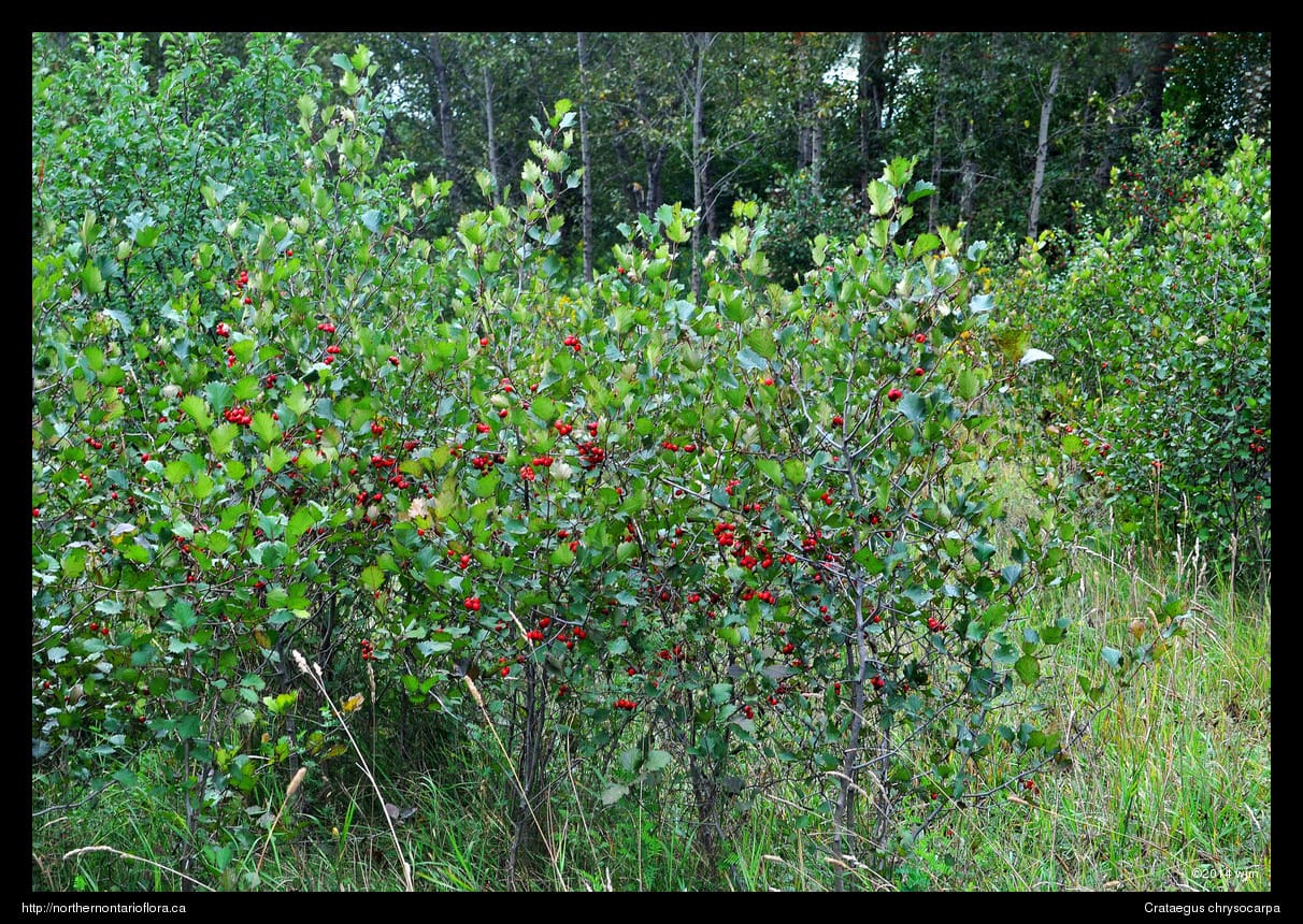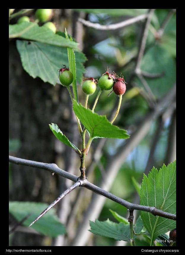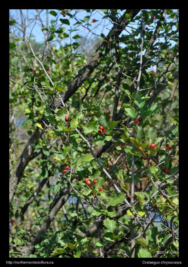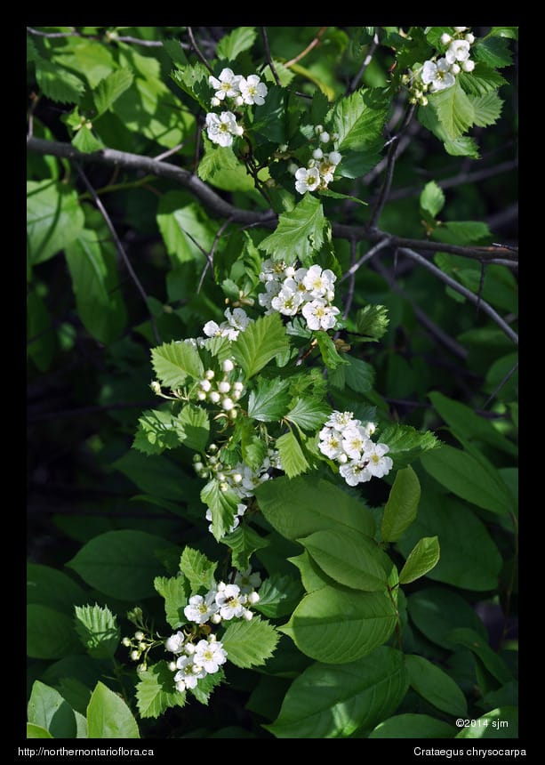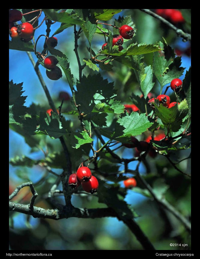 Habitat & Range: In thickets and along forest edges, often growing in rocky ground, especially along streams. Fireberry hawthorn occurs throughout much of temperate North America and includes several varieties. In Ontario, Crataegus chrysocarpa has 3 varieties; the typical var. chrysocarpa has the broadest Canadian range, extending from Newfoundland west to British Columbia, while var. faxonii (Sarg.) Eggl. and var. phoenicea E.J.Palmer ex J.B.Phipps both occur in southern Ontario and Quebec. Fireberry hawthorn (var. chrysocarpa) occurs throughout the Algoma District, extends north into the Moose River watershed and west along the southern border of northwestern Ontario; it also occurs throughout southern and eastern Ontario.