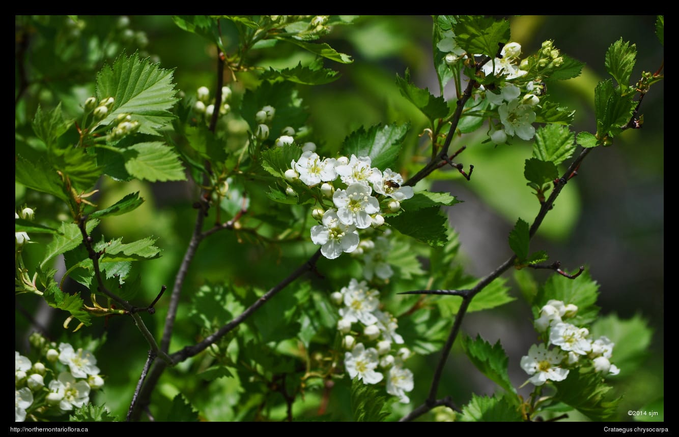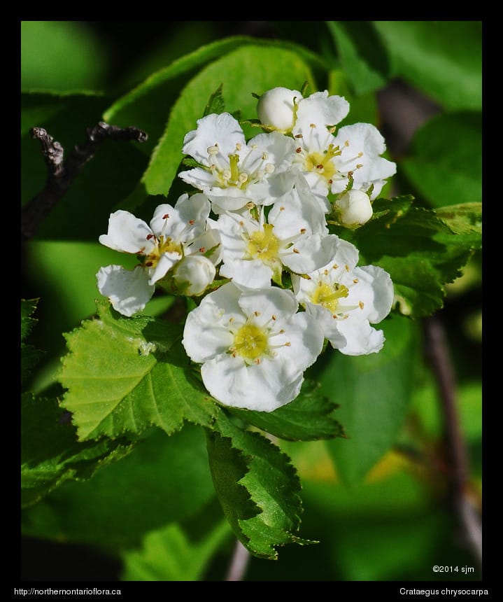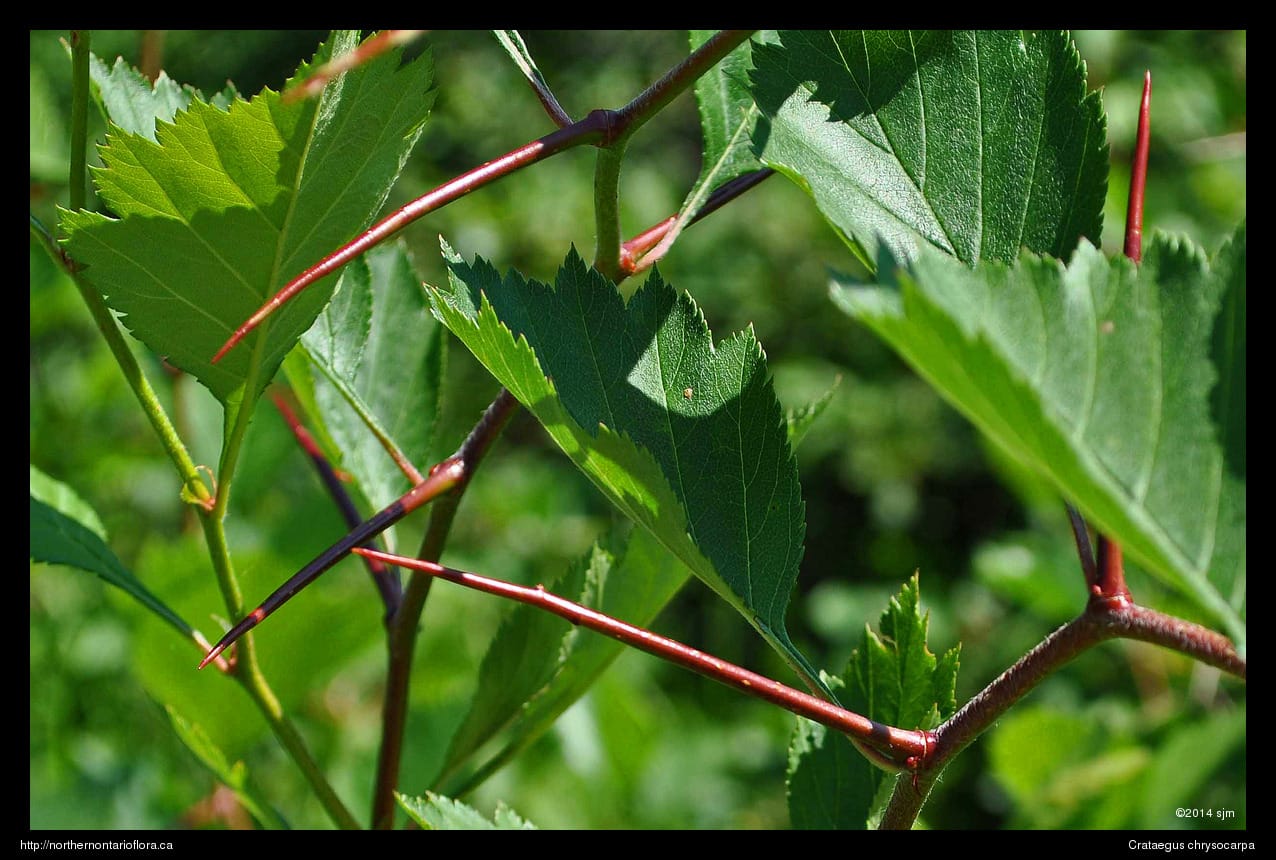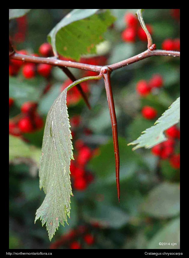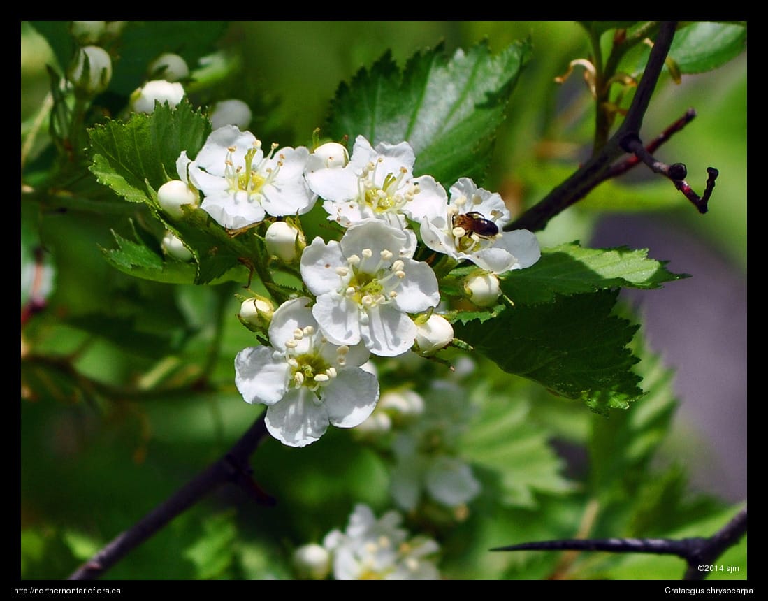 Similar Species: Black hawthorn (Crataegus douglasii), also occurs in the Algoma District; it has much shorter spines, 1—2.5 cm long, flowers with 7—10 pink-anthered stamens, and dark reddish-purple to black fruit. The flowers and inflorescences of hawthorns are similar to those of ninebark (Physocarpus opulifolius) and pin cherry (Prunus pensylvanica), neither of which have thorns. Ninebark has palmately-lobed leaves with rounded lobes and dry brownish fruit, while pin cherry has narrow lanceolate leaves and small translucent red drupes (cherries) with a single large pit.
