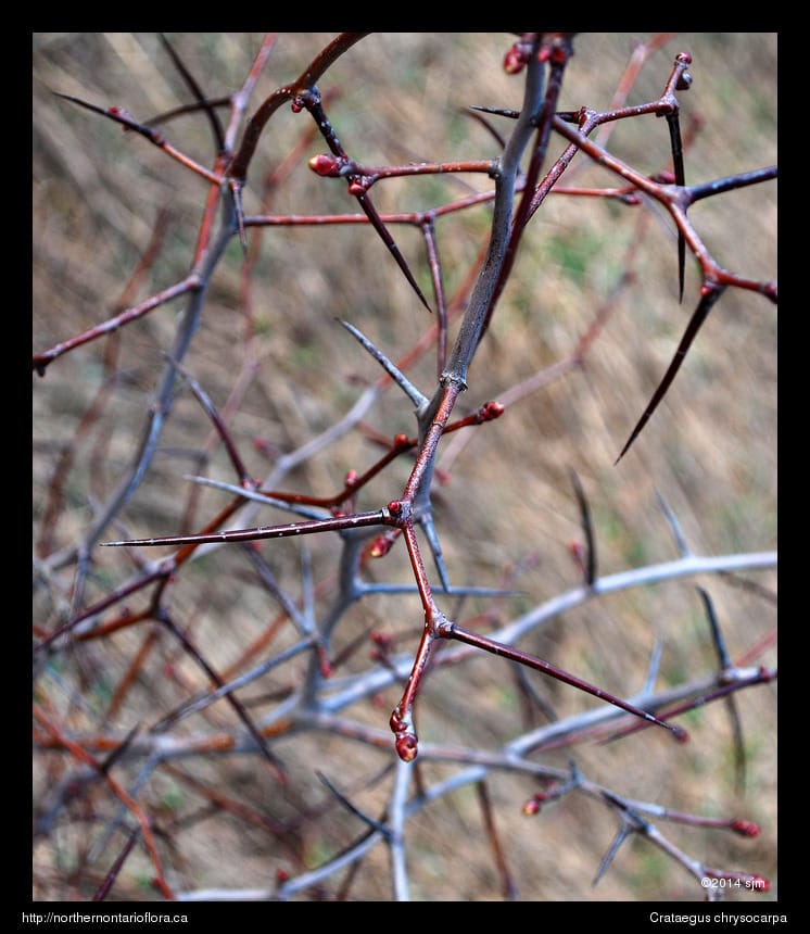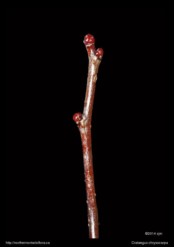 Stems/twigs: Winter twigs are reddish-brown to dark brown, smooth (glabrous), and bear long stout thorns, 2—8 cm long. The thorns may be straight or slightly curved and often bear small buds at the base or along the thorn. Buds are alternate, scaly, dark red, rounded, and shiny. Older twigs have grayish bark and bear short lateral shoots that develop into terminal flower clusters. Branches and main stems have smooth grayish-brown bark.