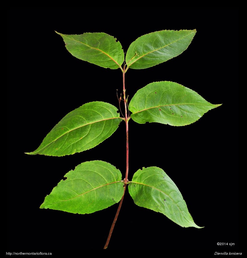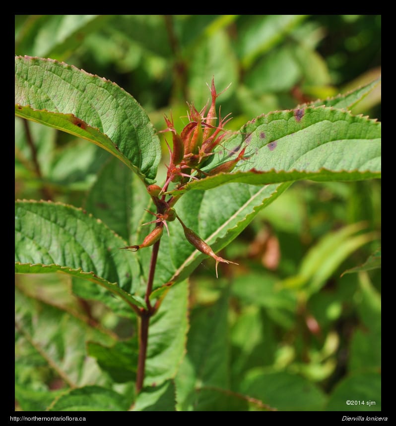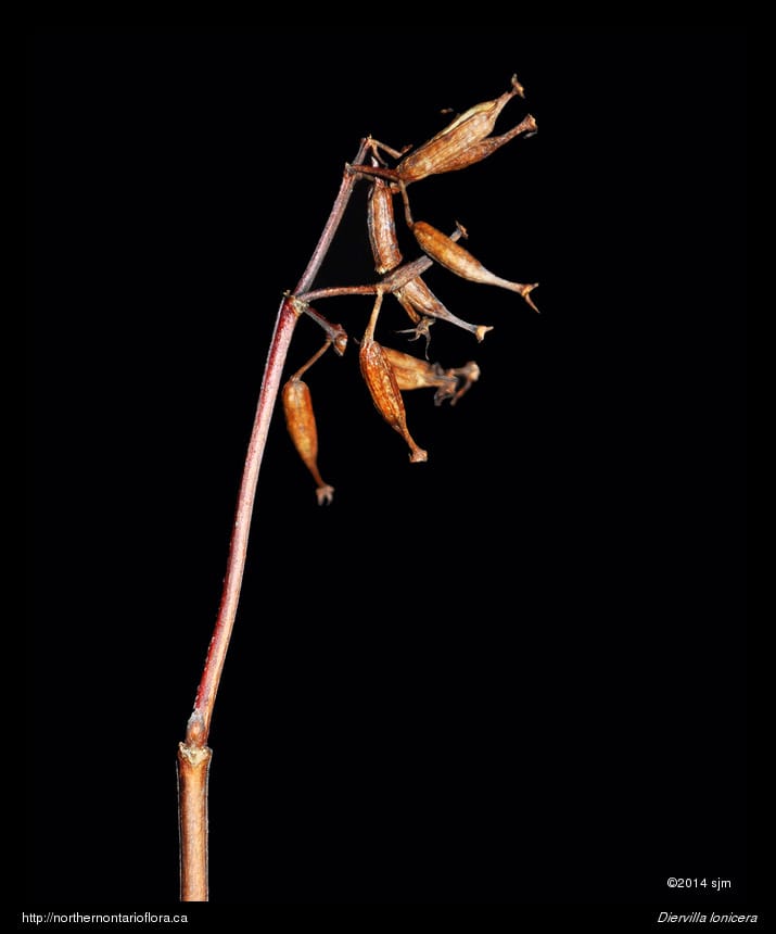 Similar Species: Northern bush honeysuckle is in the same family as true honeysuckles (Lonicera spp.) and has similarly-shaped flowers. But true honeysuckles have flowers borne in pairs, with the 2 ovaries partially fused at the base, calyx lobes are greatly reduced, their fruits are fleshy berries, and their leaves have entire margins. In contrast, Diervilla has flowers usually borne in clusters of 3 flowers, each with separate ovaries, calyx lobes are long narrow and persistent on the fruit (a dry capsule), and their leaves have serrate leaf margins.