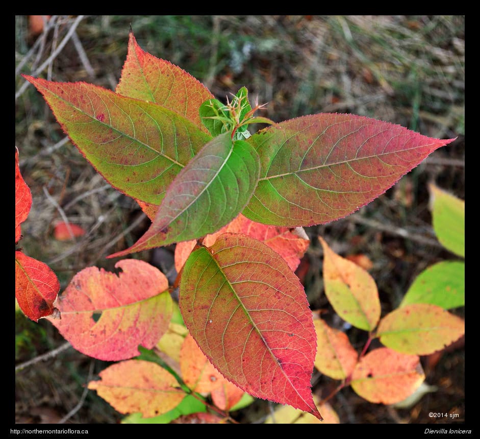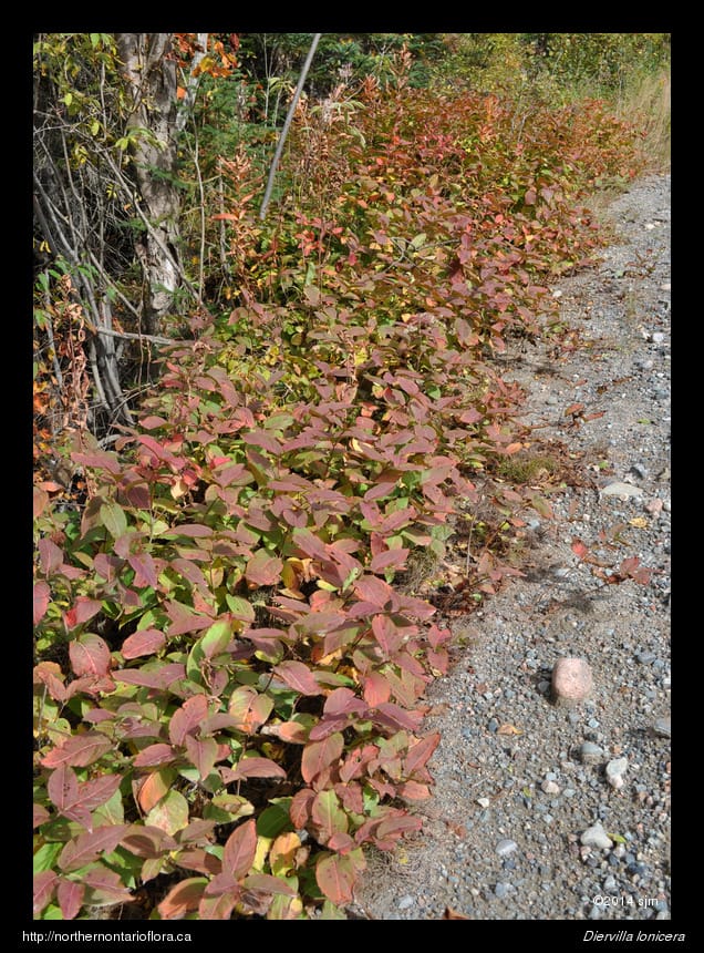 Click on a thumbnail below to see larger image.General: A low, mound-forming, deciduous shrub, usually about 0.5 m tall, seldom reaching 1 m tall in our area, and often forming extensive colonies through underground rhizomes. Northern bush honeysuckle is suitable for use in revegetation projects as well as home landscaping due to its attractive yellow to orange flowers and colourful autumn foliage.