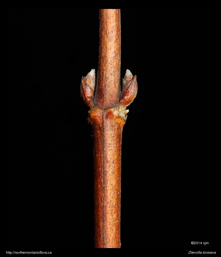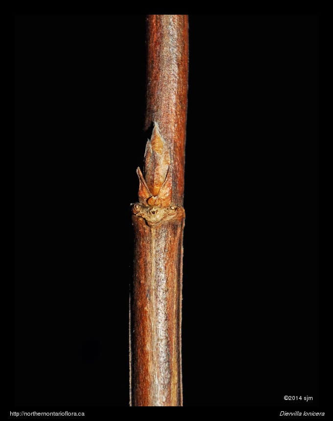 Stems/twigs: Terminal buds are lacking on previous year's flowering branches; new growth originates from lateral buds. Lateral buds are opposite, lanceolate, scaly, with about 5 pairs of small overlapping (imbricate) bud scales, and curve inward slightly towards the twig. Young stems are green to reddish; woody stems are slender, smooth (glabrous), with grey or reddish-brown bark, and marked with 4 lines extending downward from the edges and lower margin of the opposite leaf scars; older woody stems have thin shreddy bark. Leaf scars are narrowly elliptic with 3 bundle trace scars.