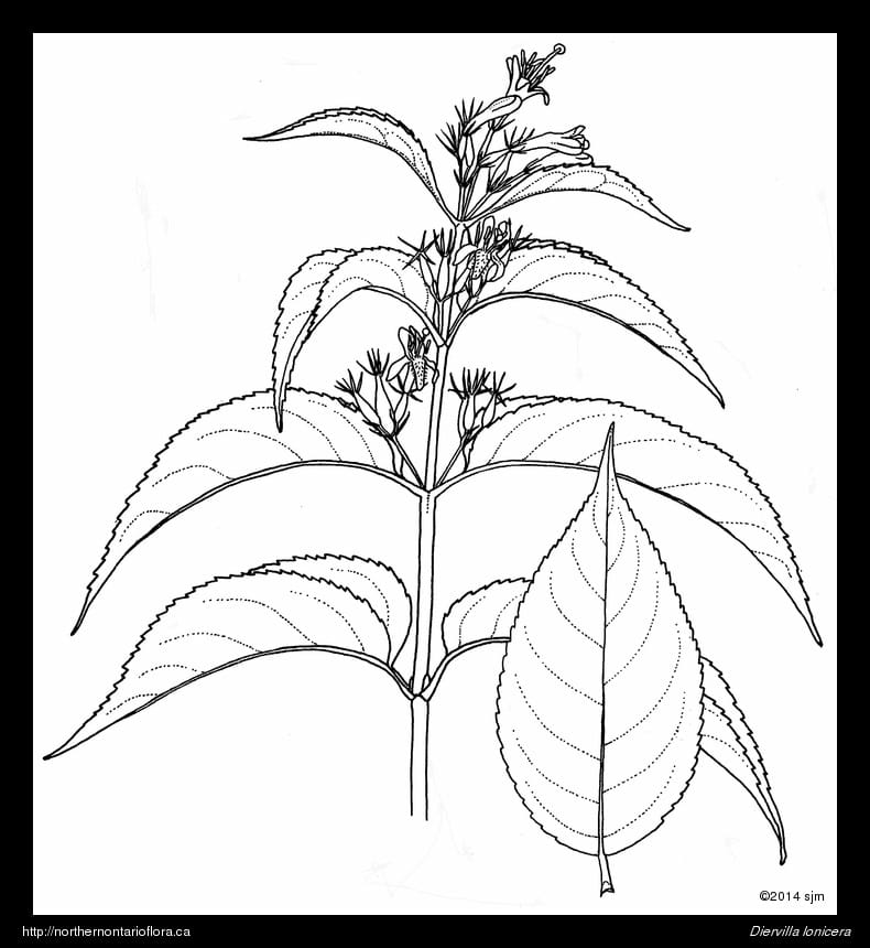 Habitat and Range: Dry forests, rocky shores and thickets, clearings and forest edges. Northern bush honeysuckle is native to northeastern North America. In Ontario, its range extends throughout the boreal forest, but is absent from barren and tundra habitats. It occurs throughout the Algoma District and extends as far north as Sandy Lake [53° N] (Soper & Heimburger 1982, Scoggan 1978).
