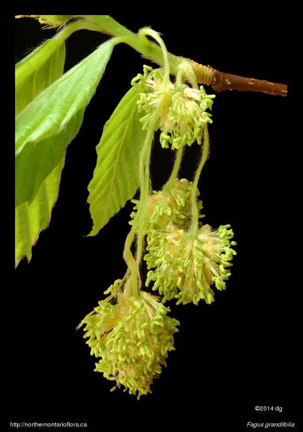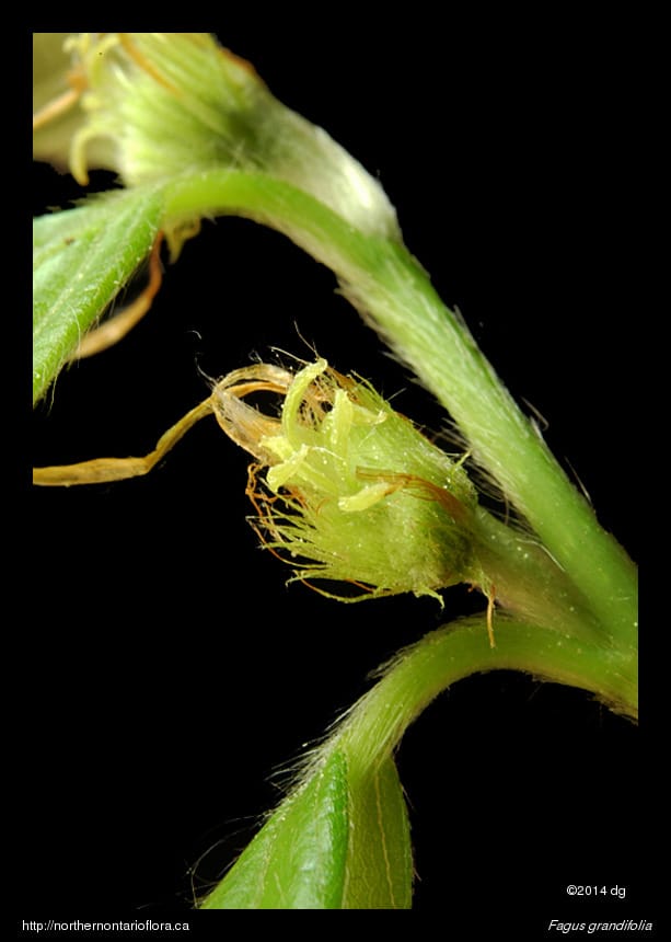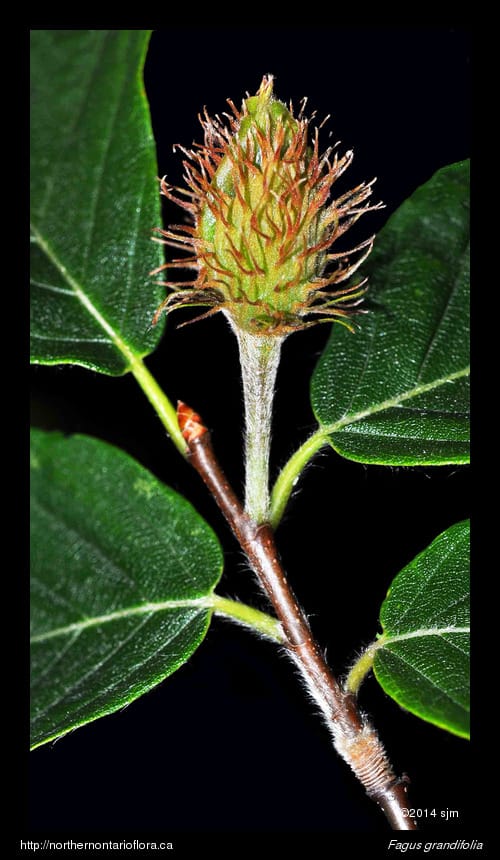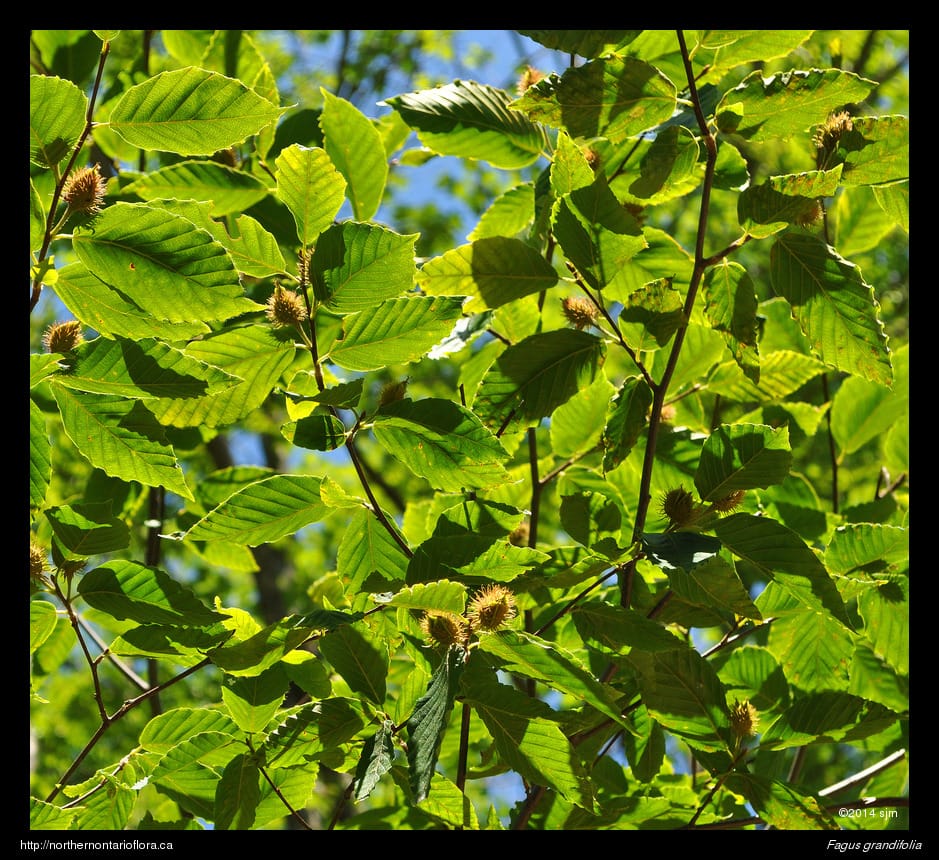 Similar Species: Castanea dentata , the American chestnut, is another tree from southern Ontario with coarsly serrate leaves and prickly fruits. This species has its male flowers borne in long, pendulous catkins and longer, narrower leaves than the American beech. The teeth of the leaf margins are sharply pointed and bristle-tipped.