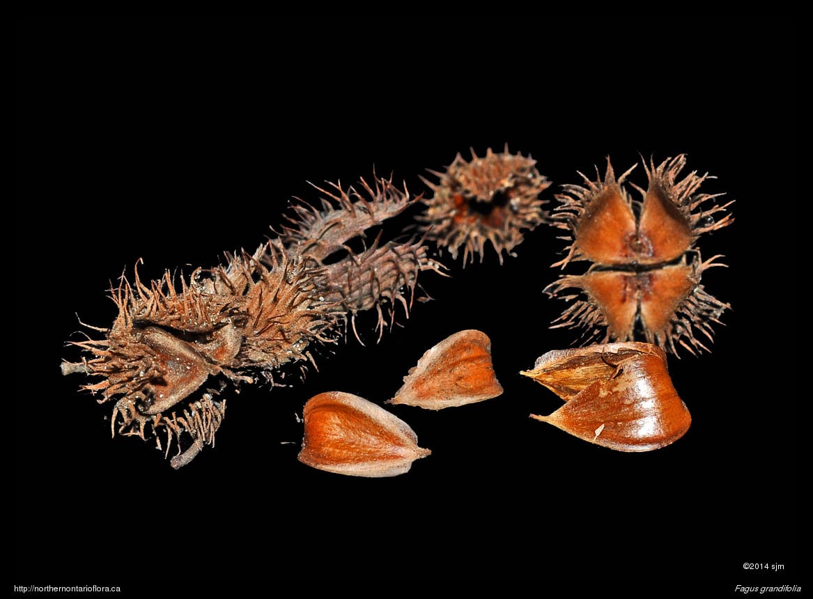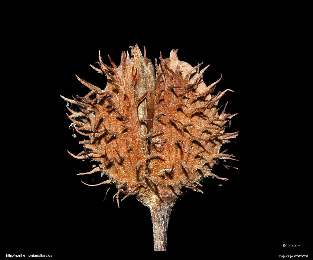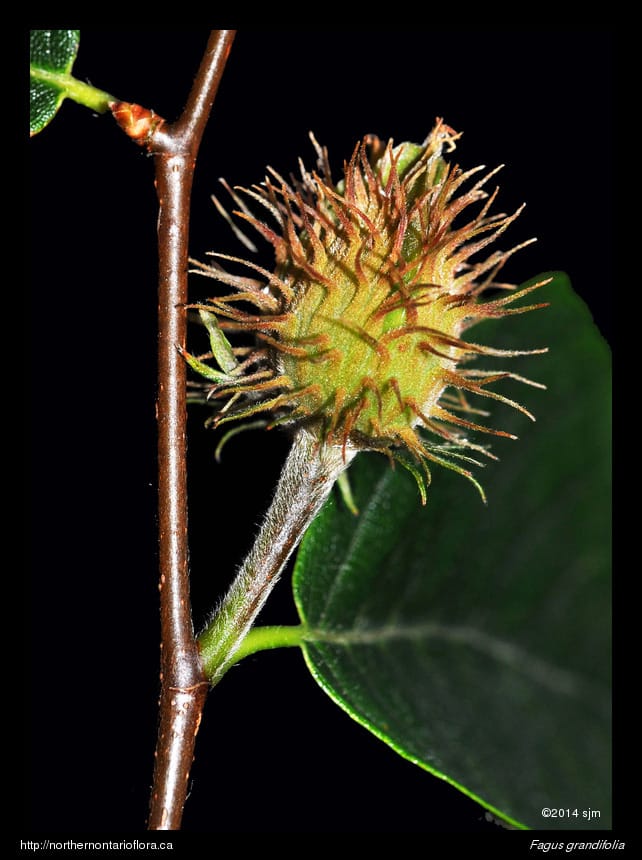 Fruit: 1–3 triangular, shiny brown, edible nuts (beech nuts), to 2.2 cm long, enclosed in a yellowish-brown to reddish-brown woody husk (burr) covered with soft spines, 4–7 mm long.