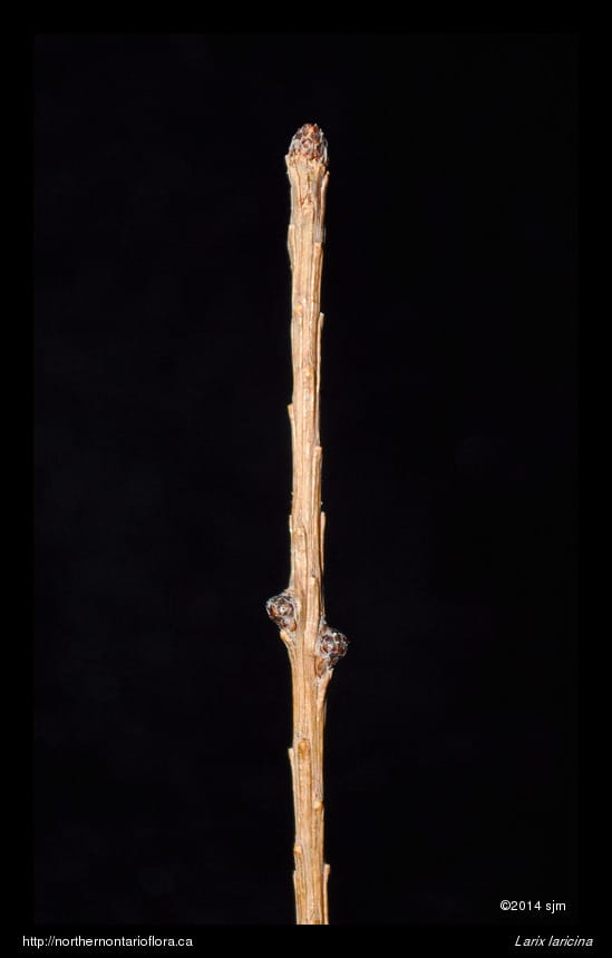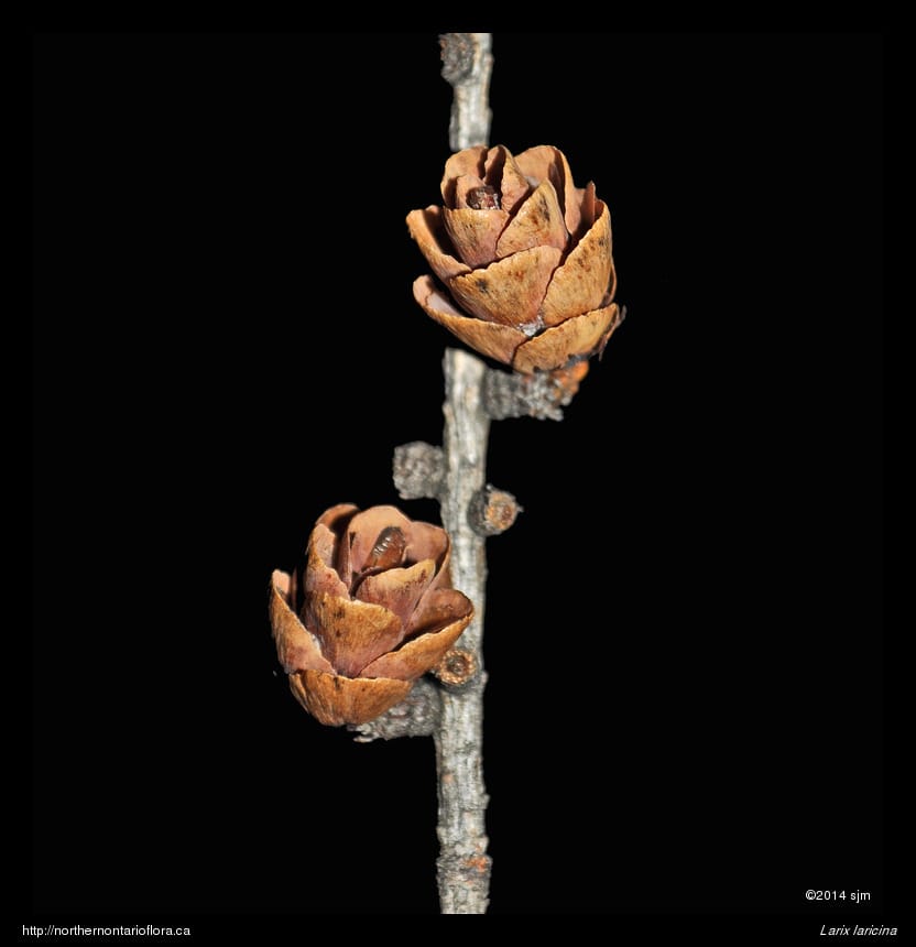 Similar Species: There are no other deciduous conifers native to Ontario, but in urban areas, a variety of European and Asian larch species may be found in parks and along streets; these can be differentiated by their much larger size (to 30 m tall) and larger cones (2-5 cm long). The most common introduced larch are Japanese larch (L. kaempferi (Lamb.) Carrière), European larch (L. decidua) Mill.), and their hybrid (L. ×marschlinsii Coaz), the Dunkeld larch.