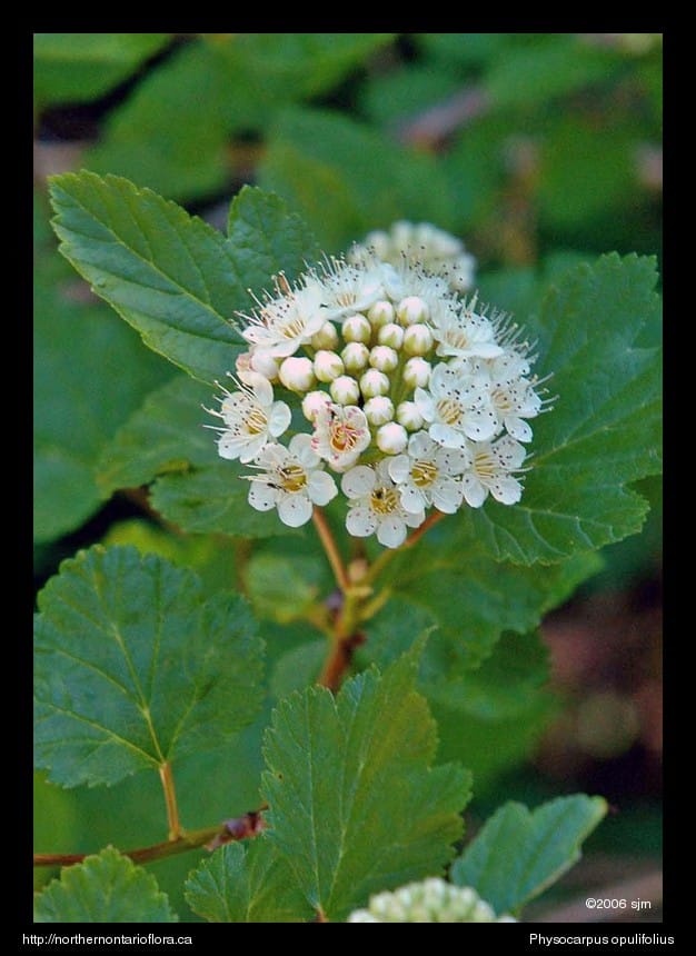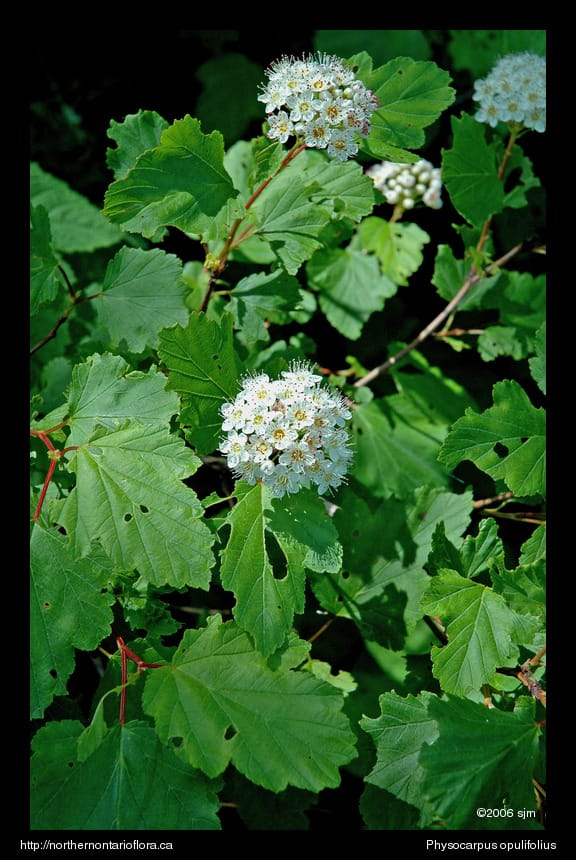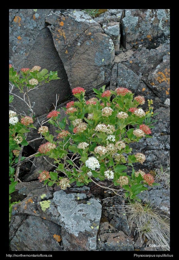 Habitat and Range: Rocky, sandy, or gravelly soils, in thickets, and often on gravel bars, shores, and streambanks. Ninebark is an eastern north-temperate to boreal species that occurs throughout eastern North America; it is common in northeastern Ontario, but is lacking west of 90° W (Soper & Heimburger 1982).