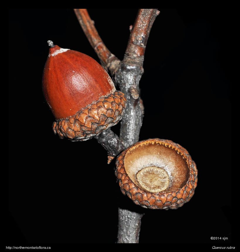 Fruit: An acorn (dry indehiscent fruit), 2—3 cm long by 1—2 cm wide, composed of an oblong nut subtended by a scaly cupule, 1.5—3 cm in diameter, which covers about ¼—½ of the base of the nut. The outer surface of the cupule consists of several tightly overlapping rows of small flat bracts. Cupule bracts are ovate with darker margins; the cupule base is flat. When immature, the nut of the acorn is green, but matures to a deep reddish-brown. Red oak acorns mature at the end of the second growing season, so first and second year acorns will be present on the same branch.