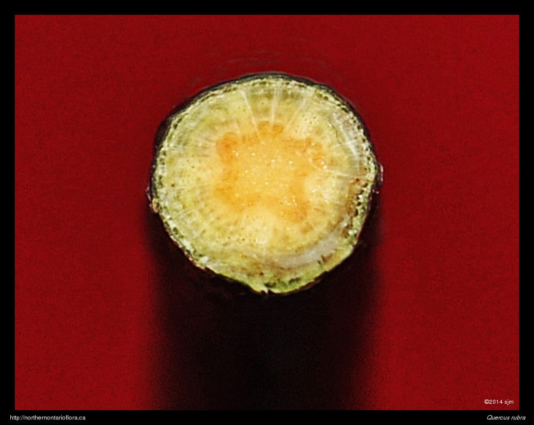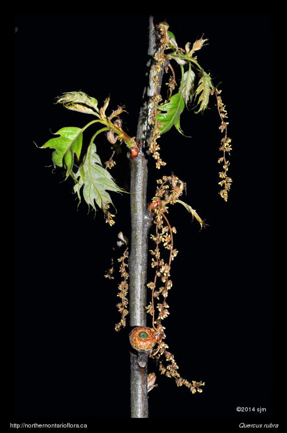 Similar Species: The only other oak native to northern Ontario is the burr oak (Quercus macrocarpa Michx.), which can be distinguished by the rounded leaf lobes that lack bristle tips, and the cupule with upper scales thickened and prolonged into fleshy tentacle-like points, producing a fringe around the upper edge of the cupule.