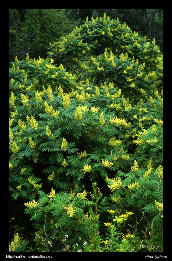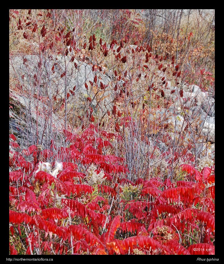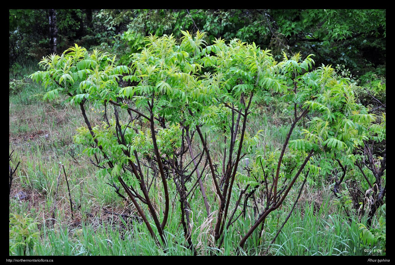 Habitat and Range: Rocky or sandy soils of roadsides, open fields, slopes, clearings, and forest edges. Staghorn sumac is native to eastern North America. In the Algoma District, staghorn sumac occurs along the North Shore, on St. Joseph and Whitefish Islands, and around the Sault Ste. Marie area, as well as throughout eastern and southern Ontario.