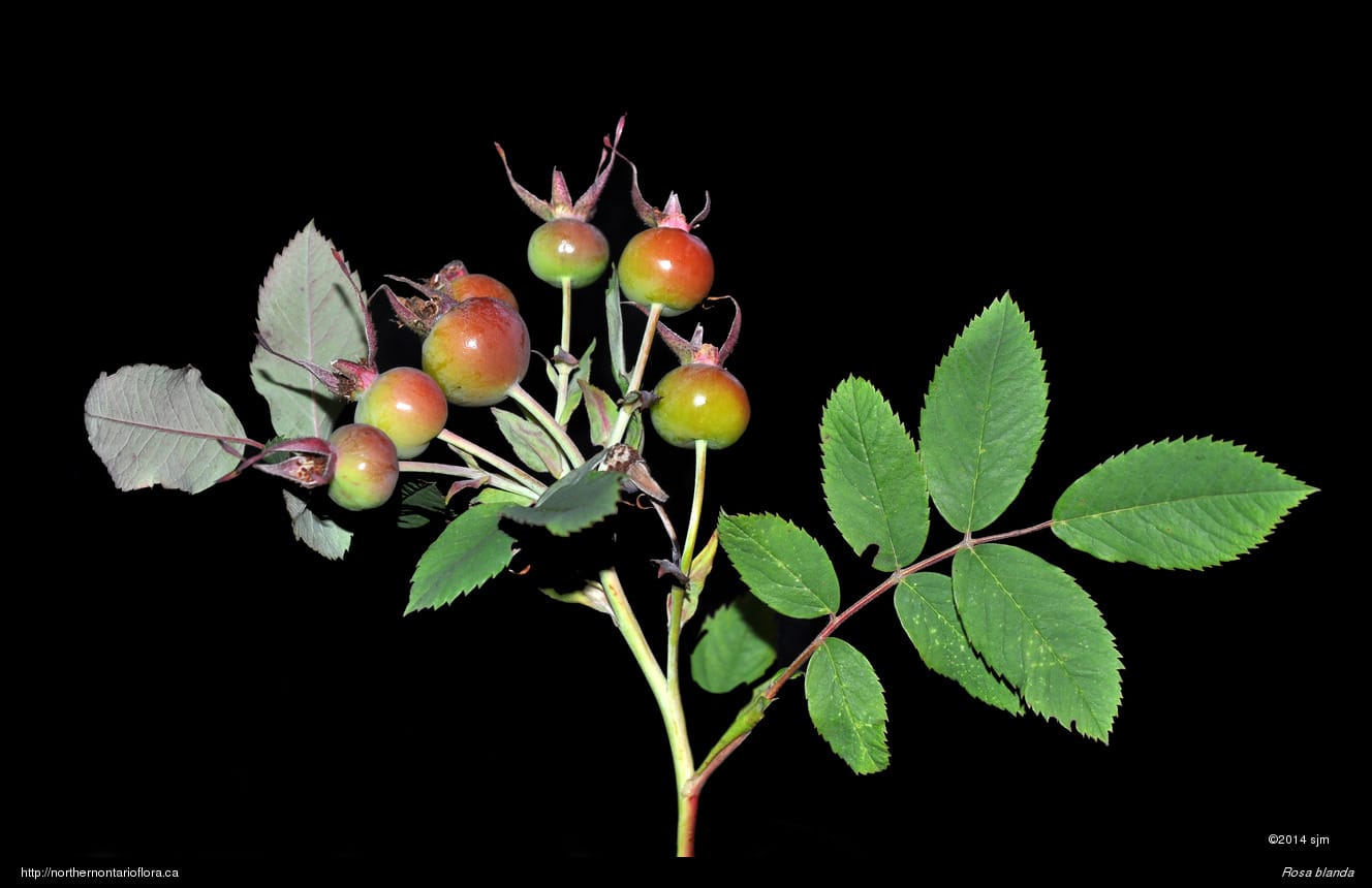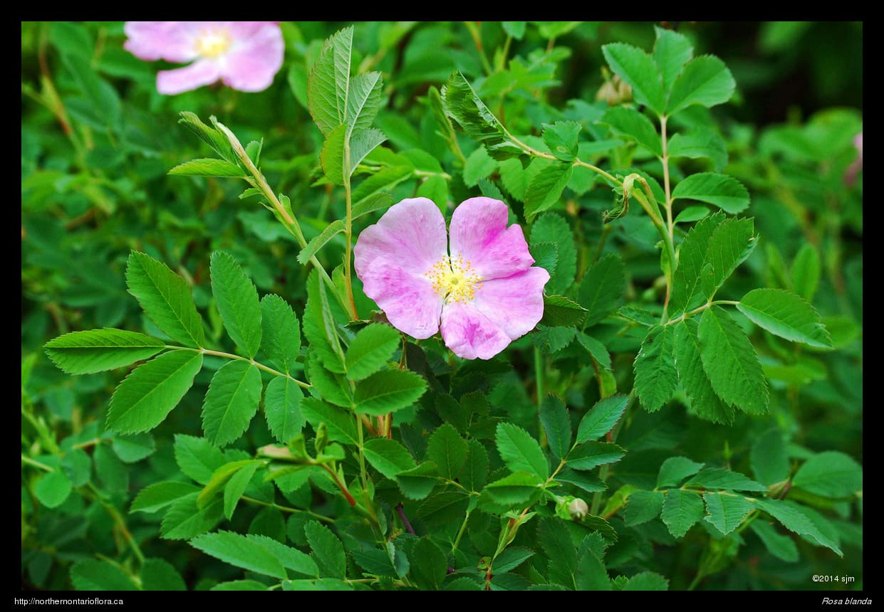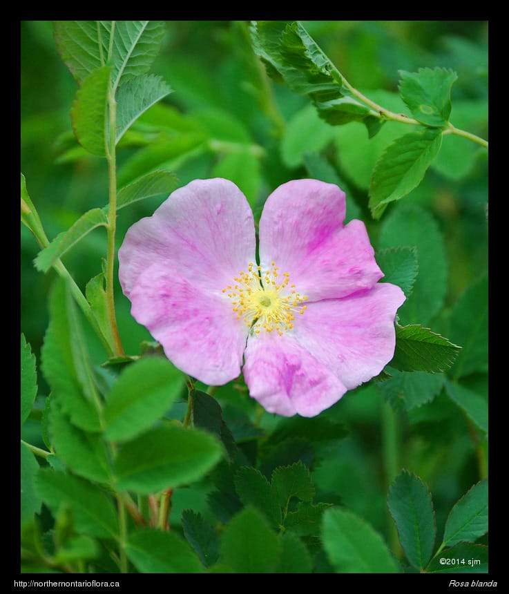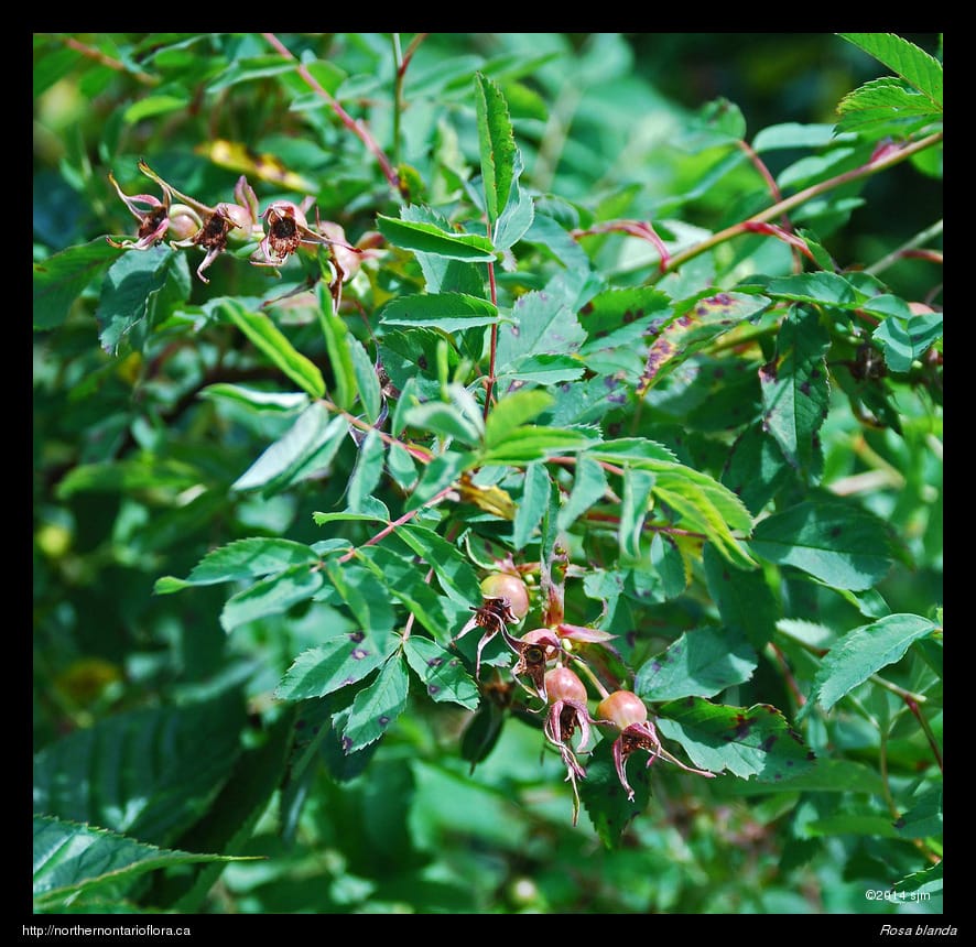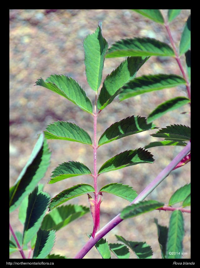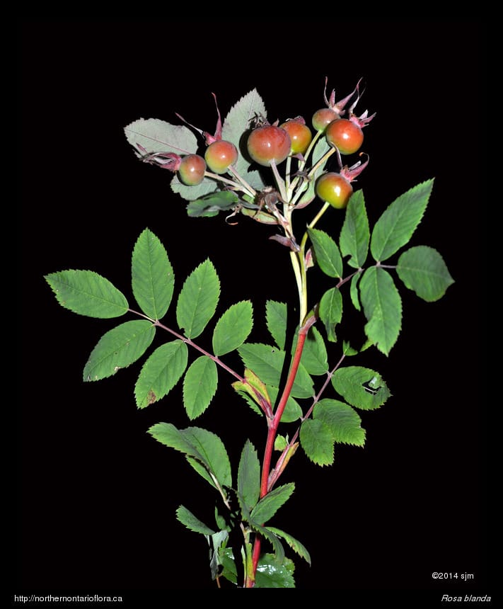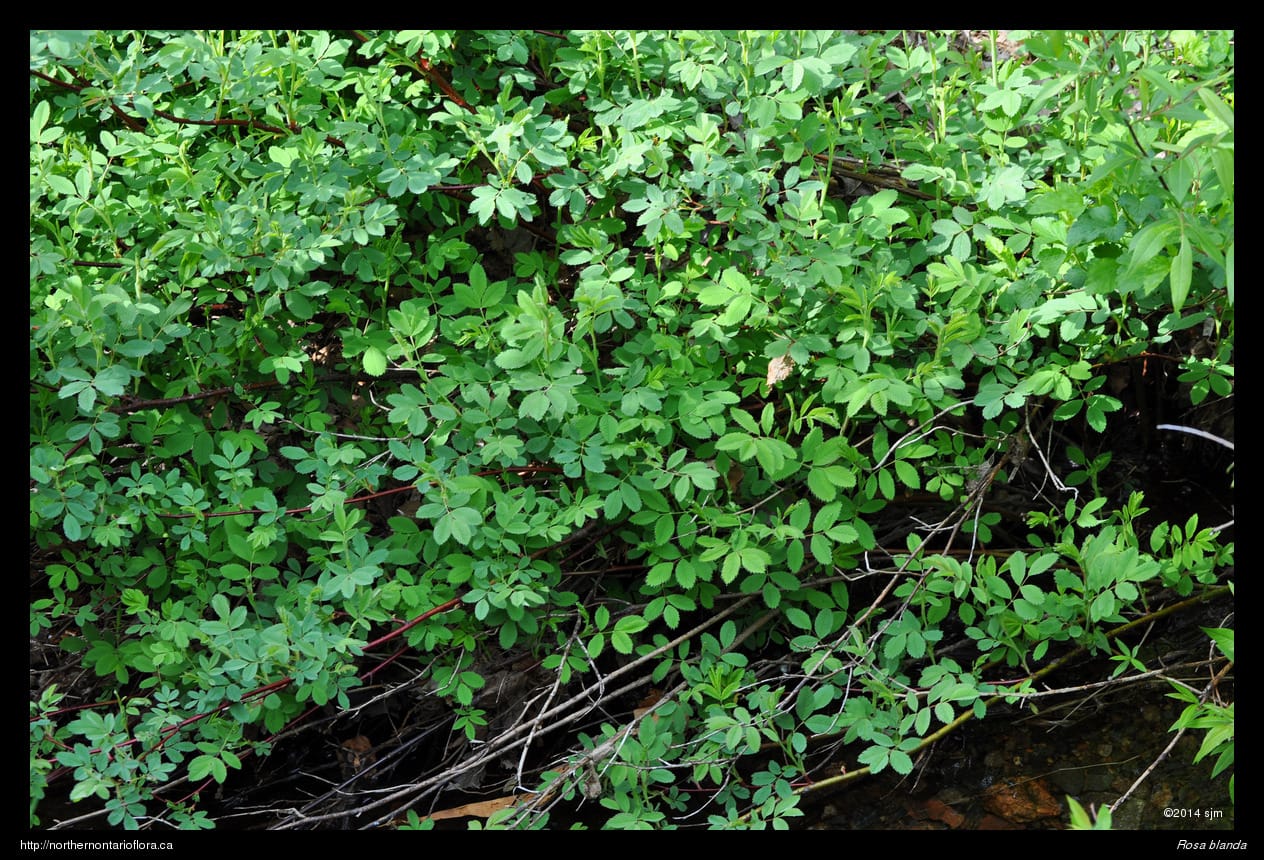 Habitat and Range: Moist to dry open woods, shrub thickets, clearings, and sandy or gravelly fields, shorelines, and roadsides; often growing over calcareous or basic bedrock or soil. The smooth rose is native to northeastern and central North America, with a range extending west from Nova Scotia to Saskatchewan and the southern North West Territories. Its range extends across Ontario and runs from southern Ontario north to James Bay, around 53° N (Soper and Heimburger 1982), and occurs throughout the Algoma District.