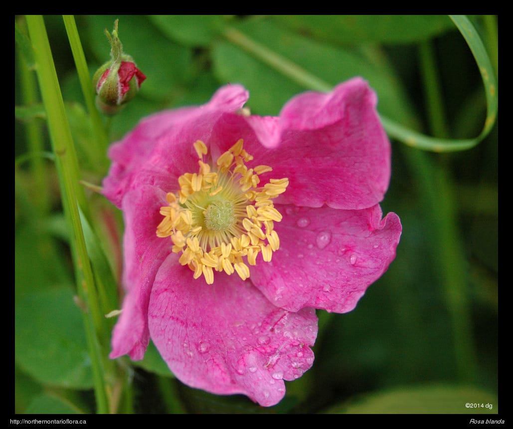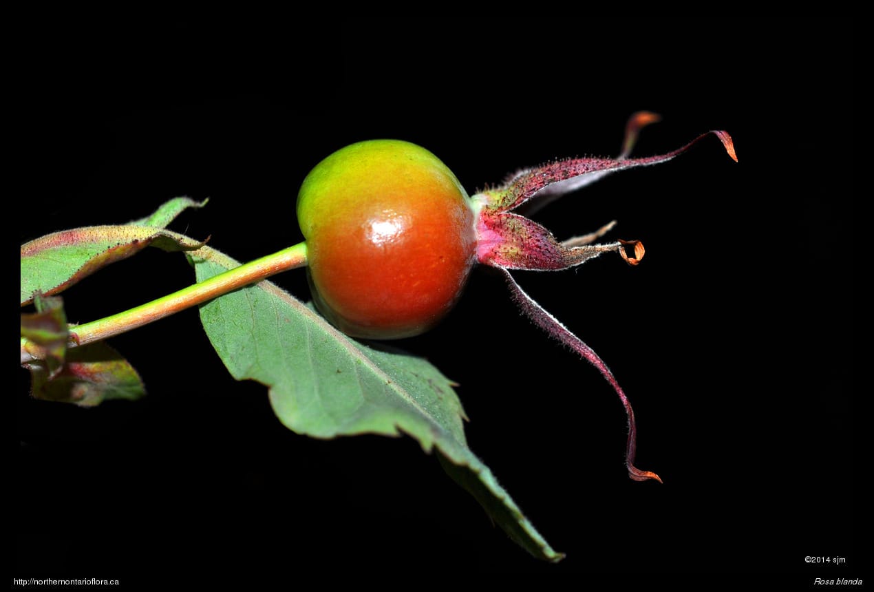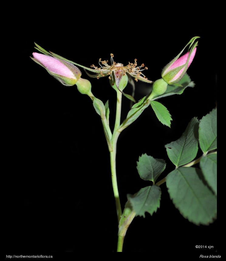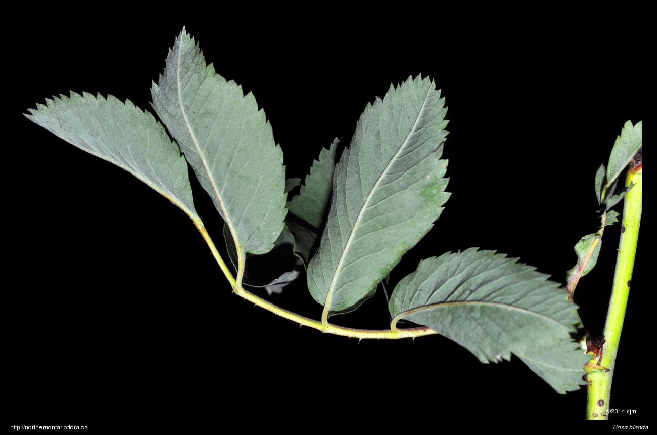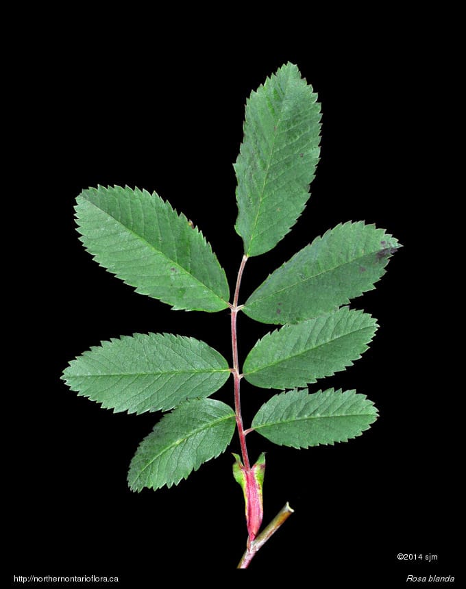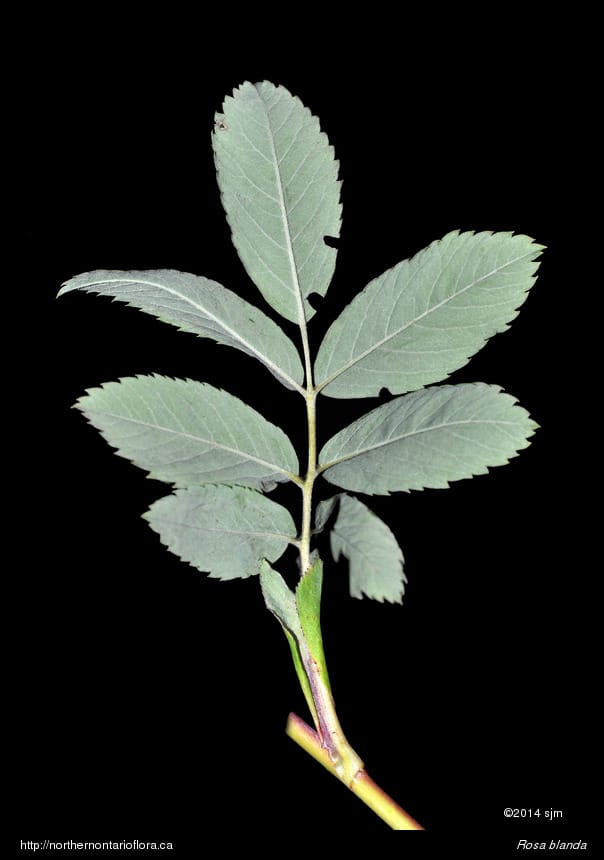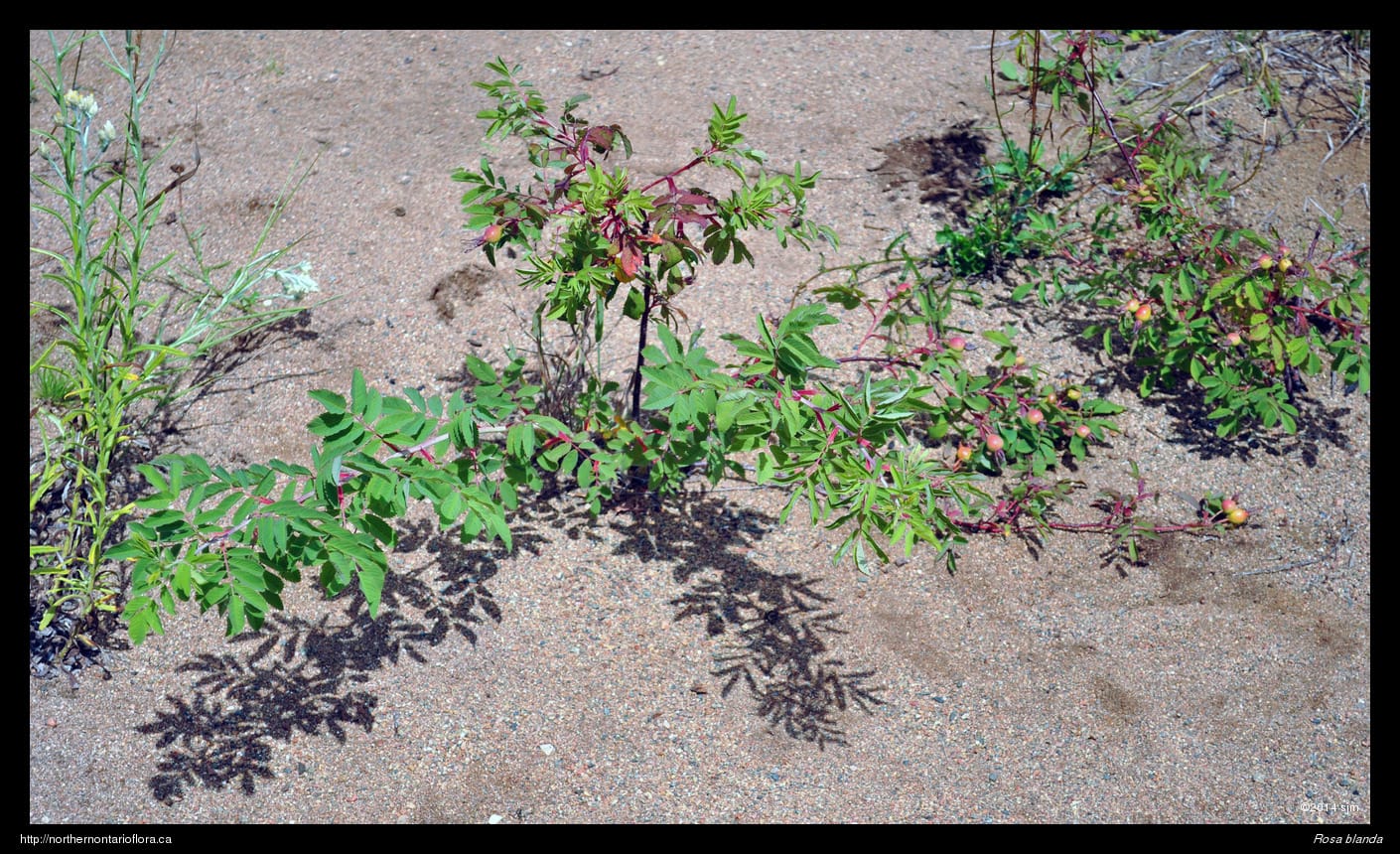 Habitat and Range: Moist to dry open woods, shrub thickets, clearings, and sandy or gravelly fields, shorelines, and roadsides; often growing over calcareous or basic bedrock or soil. The smooth rose is native to northeastern and central North America, with a range extending west from Nova Scotia to Saskatchewan and the southern North West Territories. Its range extends across Ontario and runs from southern Ontario north to James Bay, around 53° N (Soper and Heimburger 1982), and occurs throughout the Algoma District.
