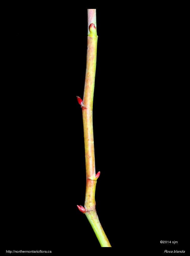 Stems/twigs: Young stems are reddish-purple, smooth (glabrous), and sometimes have a waxy bloom (glaucous). Stems are generally unarmed or rarely bear a few scattered, straight prickles along the internodes. Older stems may be armed with a few straight prickles, while vigorous shoots are often prickly at the base. Buds are greenish to red and shiny, with a few imbricate scales. Leaf scars are very narrow and broad, with stipule scars extending as thin lines from either side of the leaf scar.