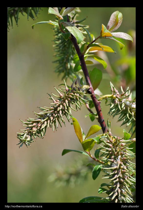 Flowers: Unisexual, male and female catkins occur on different shrubs (dioecious); flowering catkins are erect, fuzzy, and appear before the leaves. Male (staminate) catkins are 2.3—5.2 cm long by 1.2—2.2 cm wide; each male flower has 2 stamens subtended by a floral bract, 0.6-1.1 mm long. Female (pistillate) catkins are 2.5—10.8 cm long by 1.2—3.3 cm wide; female flowers have a single hairy pistil on a short stalk (stipe), 1.6—2.7 mm long, a single style, and 2 stigmas; the pistil is subtended by a floral bract, 1.4—2.5 mm long. Floral bracts are oblong, dark brown to black, and have long silky hairs on the outer surface; these hairs, about twice the length of the bracts, give the emerging catkins their fuzzy silver-grey appearance. Small nectaries, 0.7—1.3 mm long, are present in each flower, situated between the stamens or pistil and the axis of the catkin. Unlike most plants with catkins, willow flowers are pollinated by insects rather than wind.