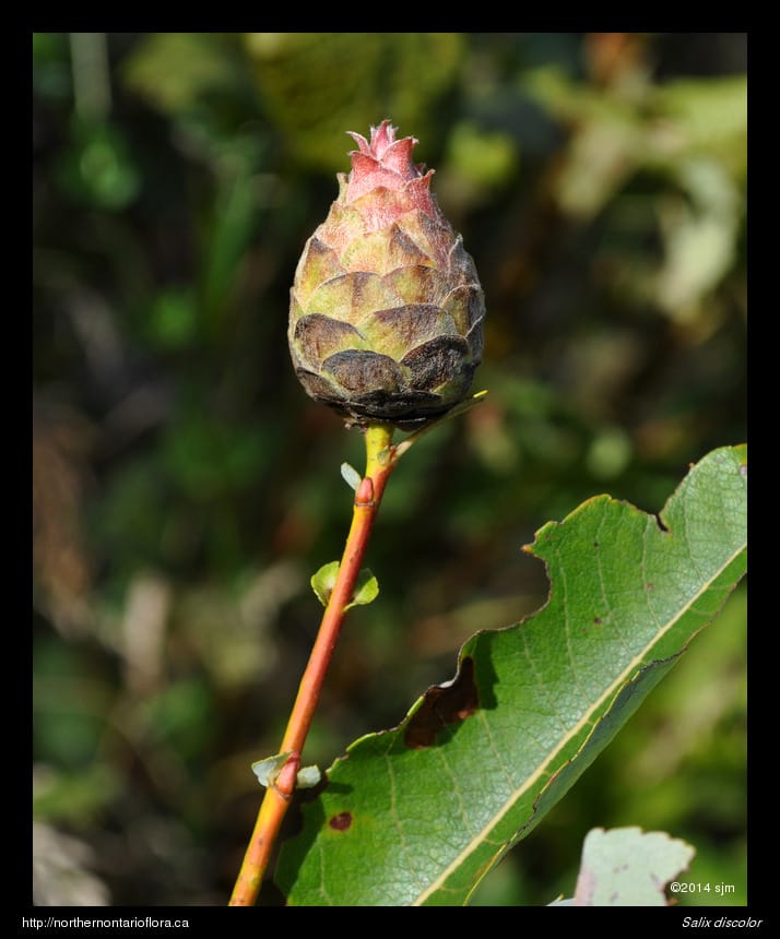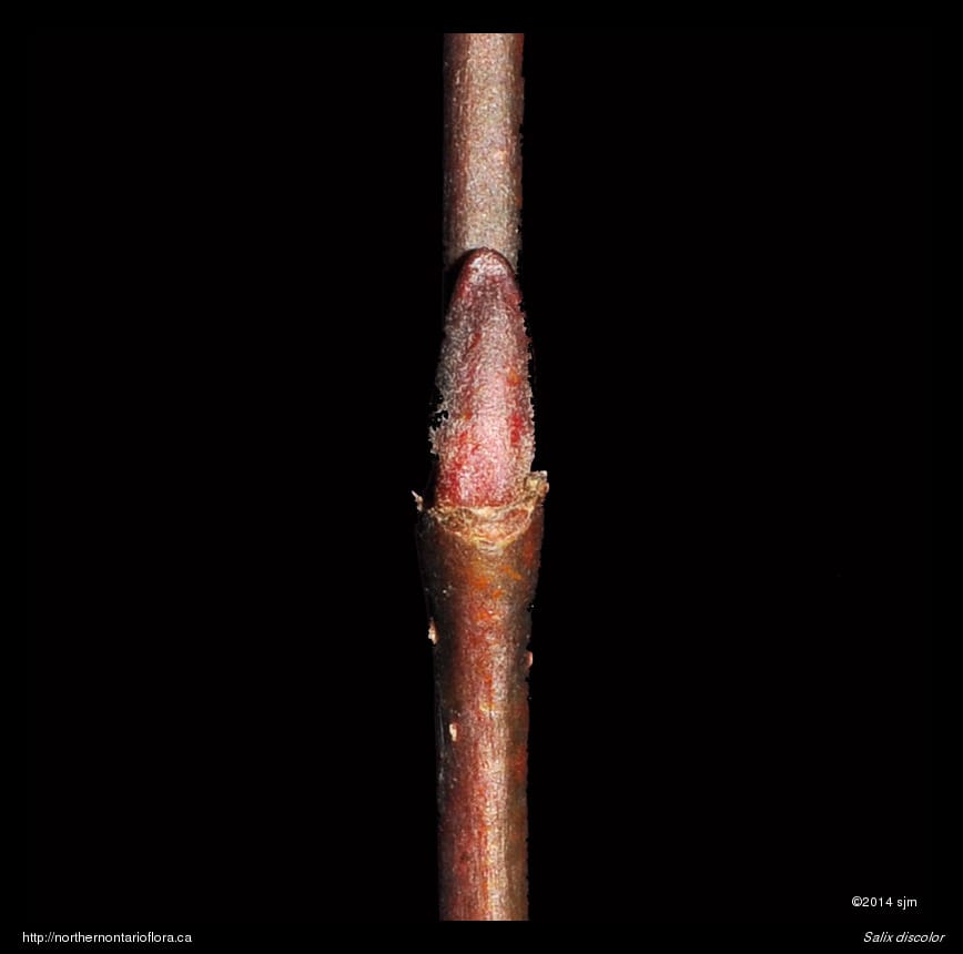 Stems/twigs: Twigs slender, dark reddish-brown; buds alternate, with a single reddish-brown bud scale enclosing each bud. Flower buds are 2—3 times larger than vegetative buds. In spring, the bud scale splits along the surface adjacent to the stem and soon falls off. Young stems and winter twigs may be finely hairy, but older stems are smooth (glabrous). Leaf scars are broadly U-shaped with 3 bundle trace scars. Occasionally, a large cone-shaped structure forms at the tip of a willow branch. This odd-looking structure is a pinecone willow gall, which develops after a small fly-like insect (the gall midge) lays an egg in the stem's terminal bud. As the larva develops, it releases a chemical that interferes with normal plant growth, causing a large gall to develop. Slicing open one of these galls will reveal a small larva in the centre.