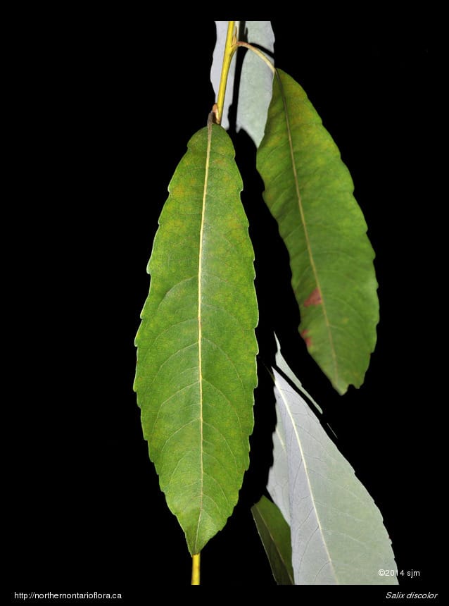 Similar Species: The upland willow (Salix humilis Marshall) has leaves roughly the same size and shape as those of the pussy willow, but the lower surface of upland willow leaves is densely woolly with matted greyish hairs. Bebb's willow (Salix bebbiana Sarg.) also has leaves with tapering bases, but the leaves are shorter, more elliptic, rugose above with impressed veins, and hairy on both surfaces.