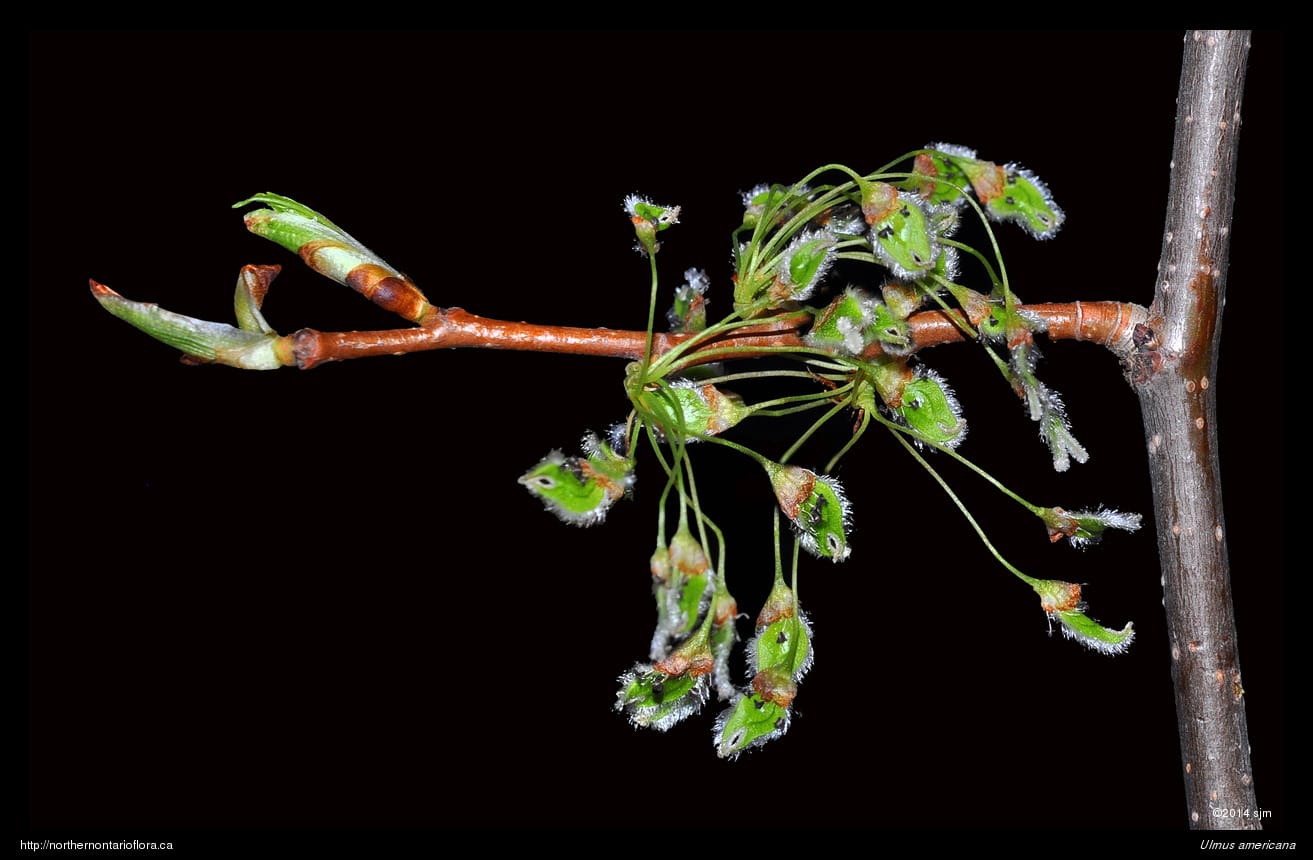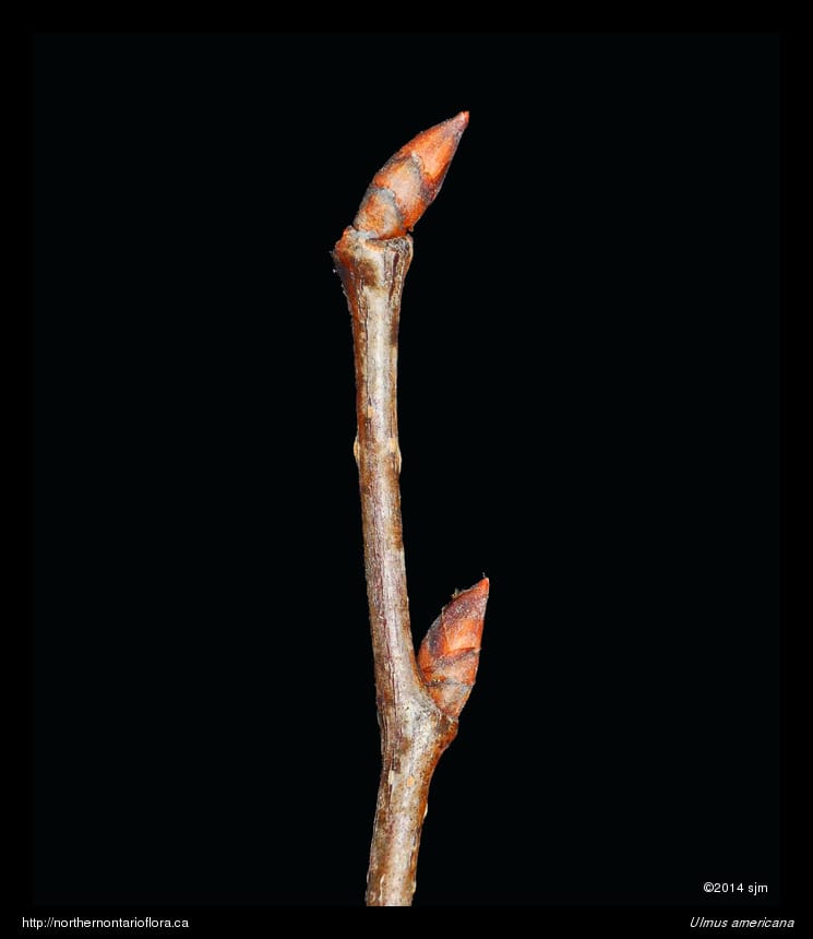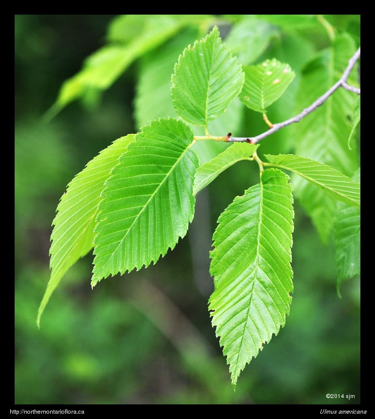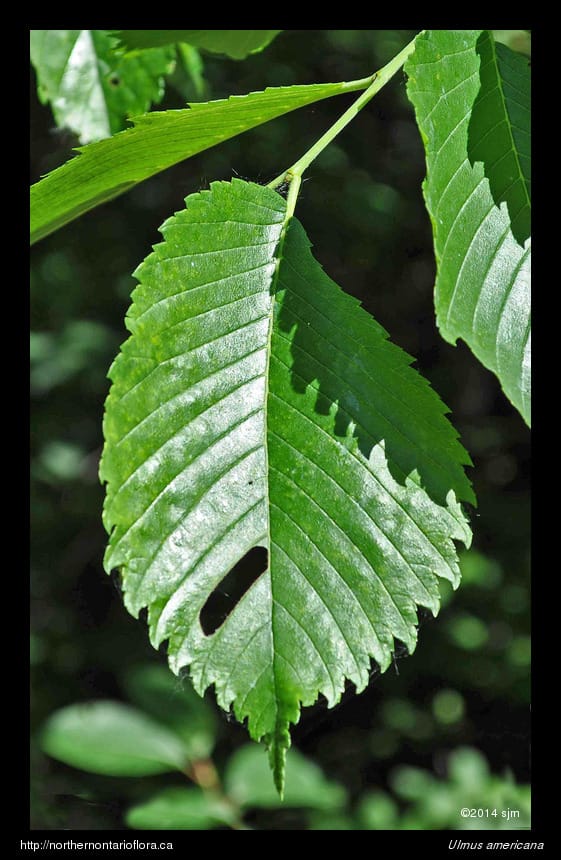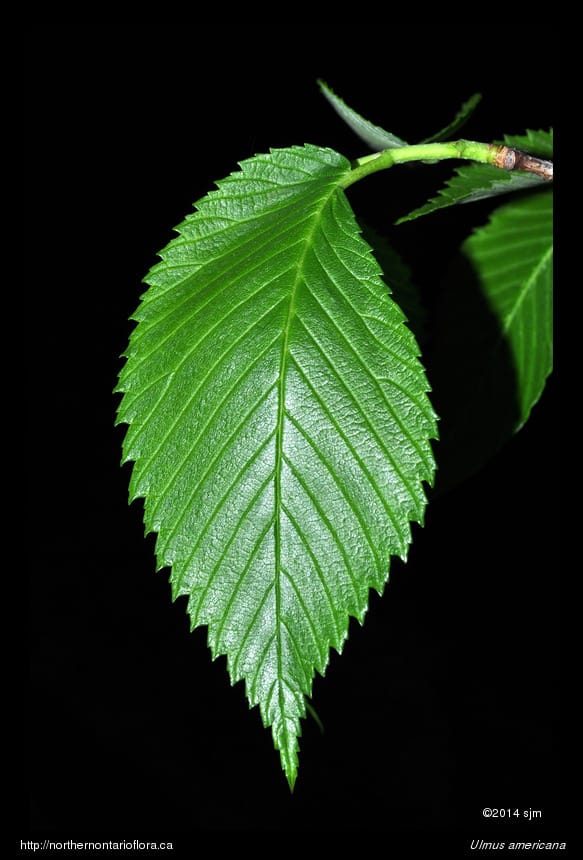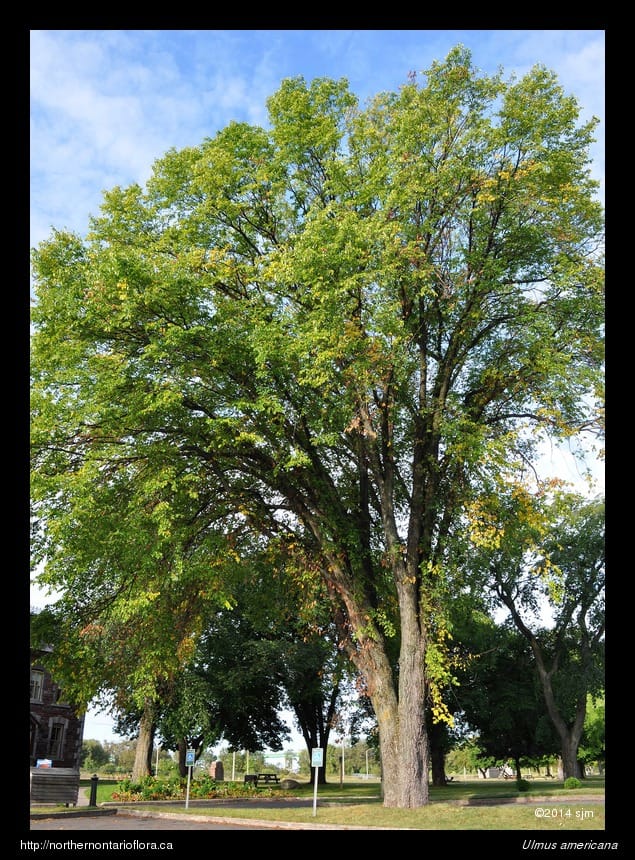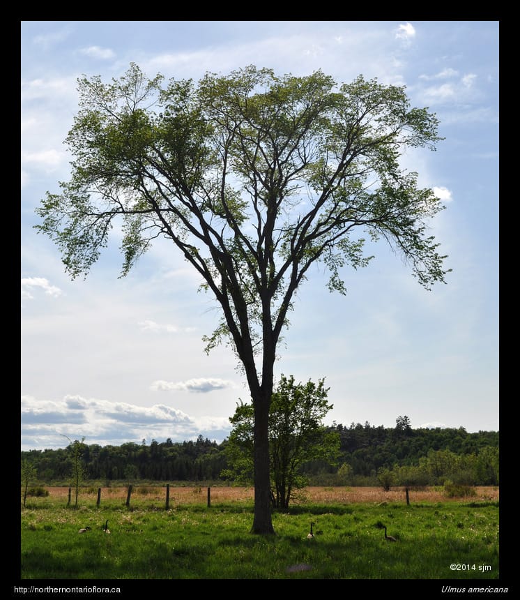 Click on a thumbnail below to see larger image.General: A large deciduous tree, 20—35 m tall, with a spreading crown ending in gracefully drooping branches, easily recognized by its vase-shaped profile. White elm trees are moderately shade tolerant; the root system is shallow and widespread in wet soils, but deeper in drier soils; stumps often produce stump sprouts after cutting. Its wood is used for hockey sticks, furniture, and timber. White elm is very susceptible to Dutch elm disease, caused by a wilt fungus, Ophiostoma ulmi(Buism.) Nannf. (formerly Ceratocystis ulmi). Prior to the introduction of this disease to North America, white elm trees were frequently planted as street or shade trees.