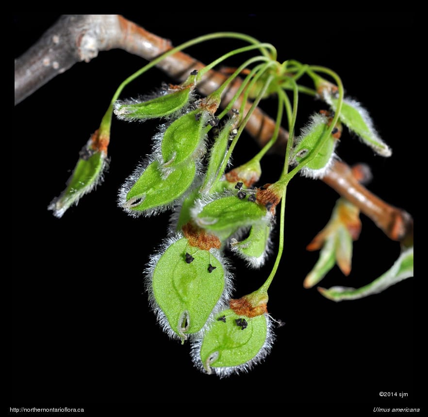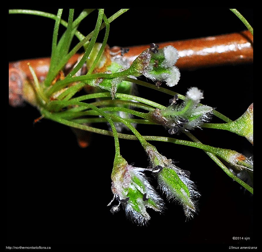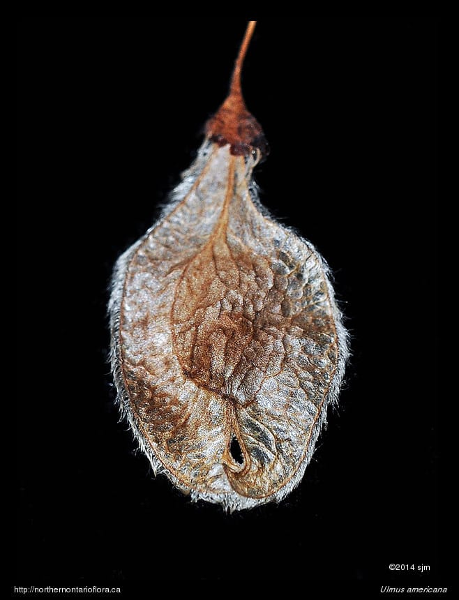 Similar Species: The rock elm (Ulmus thomasii Sarg.), native to eastern and southern Ontario, also has samaras with ciliate margins, but can be distinguished by the corky ridges on older branches, flowers arranged in elongate racemes, and samaras that are hairy on the surface, as well as the margins. Slippery elm (Ulmus rubra Muhl.), native to portions of eastern and southern Ontario, has hairy leaves, short-stalked flowers and fruit, and nearly orbicular samaras with entire margins.