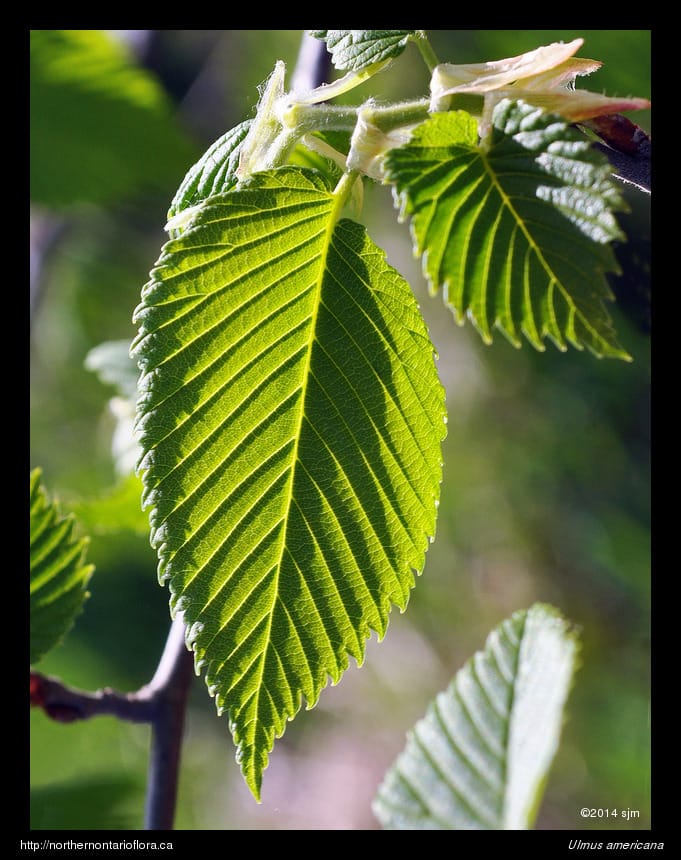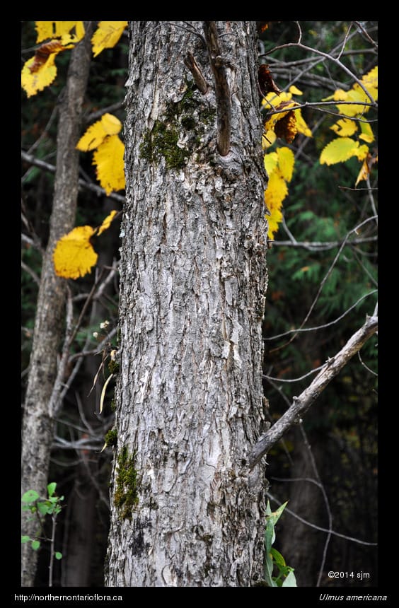 Habitat and Range: Rich deciduous and mixedwood forests in valleys, old fields, wetland margins, streambanks, and flood plains. White elm is native to temperate and boreal forests of eastern North America; its Canadian range extends from Nova Scotia to southern Saskatchewan. White elm is found throughout most of the Algoma District; it also occurs throughout southern and eastern Ontario, as well as southern portions of northwestern Ontario.