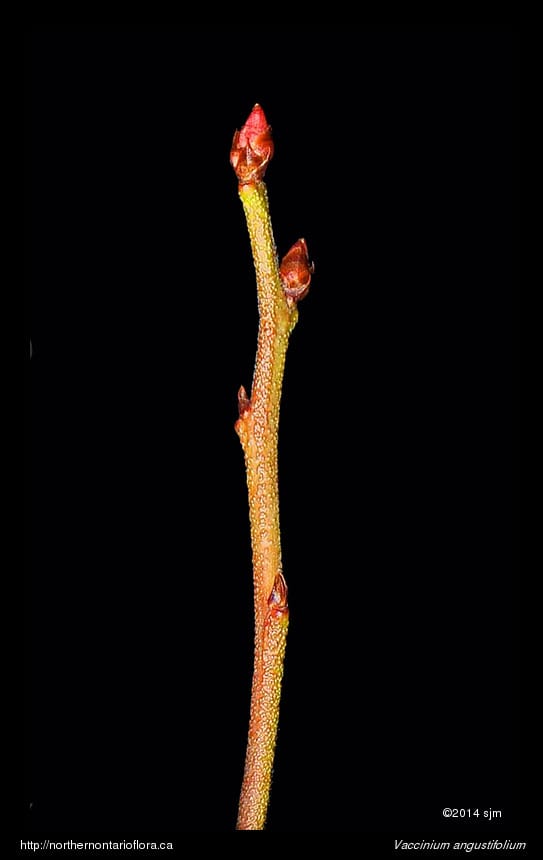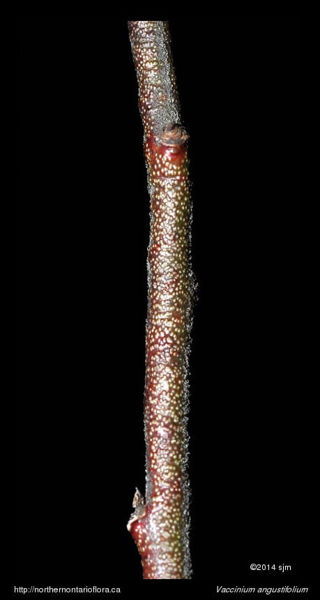 Stems/twigs: Young twigs are usually greenish-brown and covered with numerous very small bumps (stems minutely warty); twigs are hairless (glabrous) and slightly angled or with 2 vertical lines of very fine short hairs along the length of the stem. Mature stems are reddish-brown to dark brown with flaky bark. Buds are alternate, small, scaly, and pointed (acute); flower buds, located near the stem tips, are ovoid and larger than the vegetative buds. Leaf scars are small and narrowly semi-circular, with a single bundle trace scar.