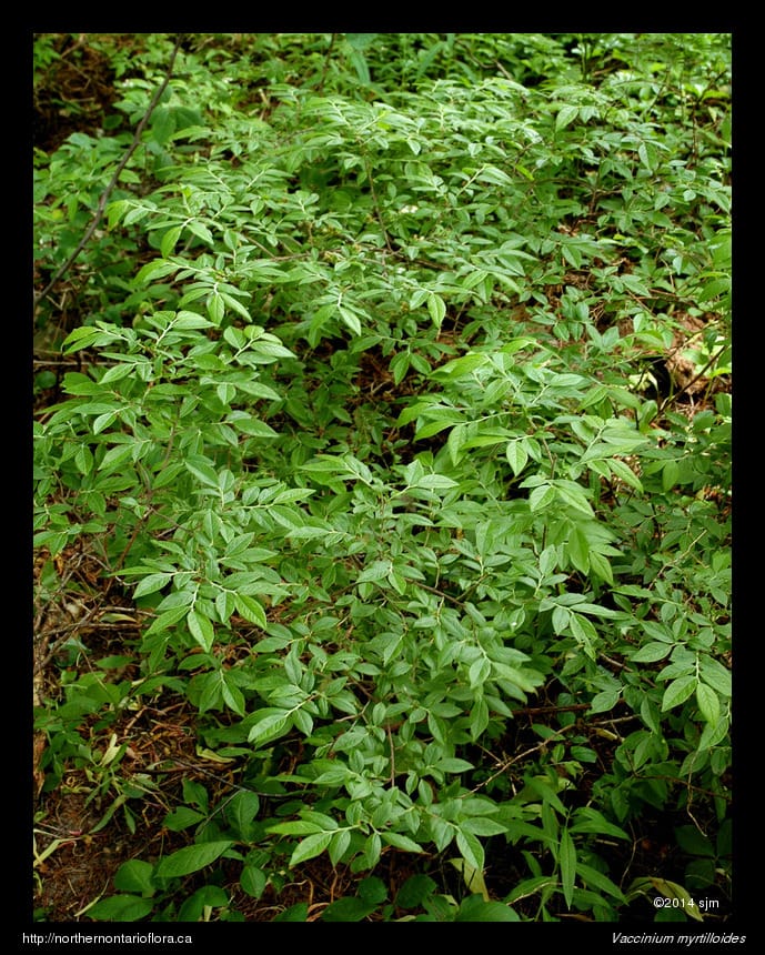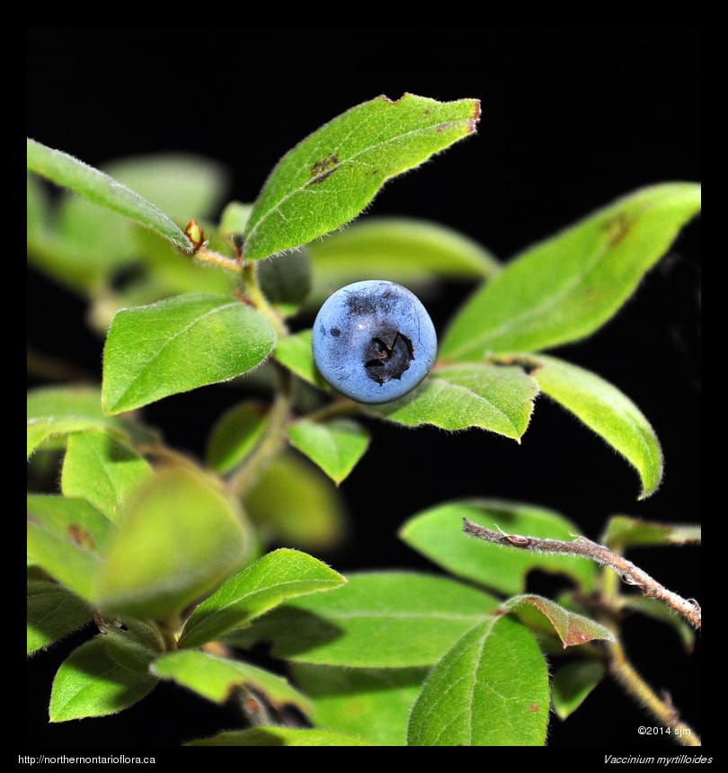 Habitat and Range: Moist to dry, sandy, or rocky soils, in open forests, barrens, and wetlands borders. Vaccinium myrtilloides is a boreal North America species with a transcontinental range, extending from Labrador to British-Columbia and the North West Territories; it occurs throughout most of Ontario, except for coastal Hudson Bay (Soper & Heimburger 1982).