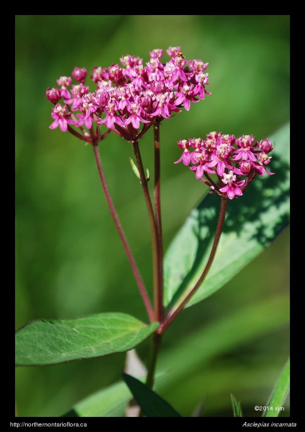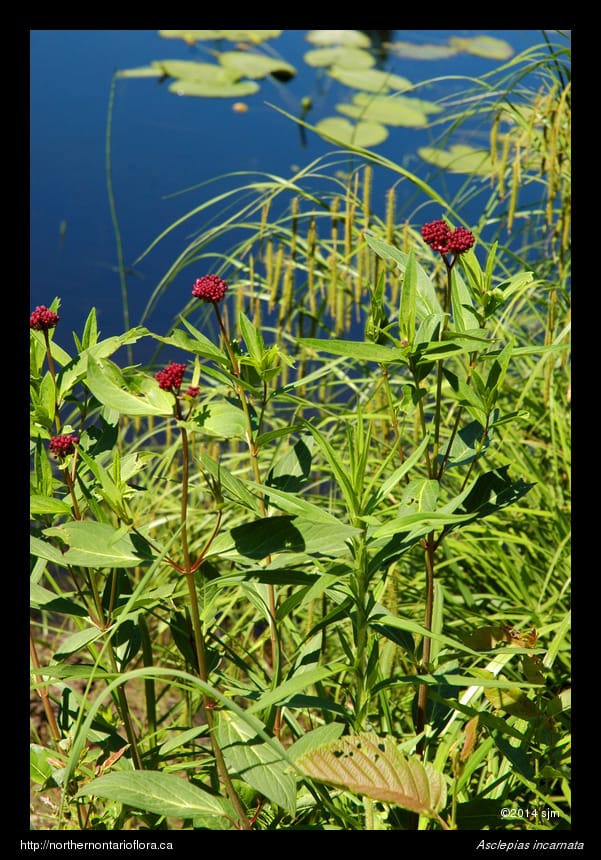 Similar Species: The only other milkweed species well-distributed in northeastern Ontario is the common milkweed (Asclepias syriaca L.), which is easily distinguished by its larger stiff oblong leaves and lighter pink to purplish flowers. Common milkweed is found in drier, usually disturbed, habitats, such as fallow fields, railway rights-of-way, and roadsides.