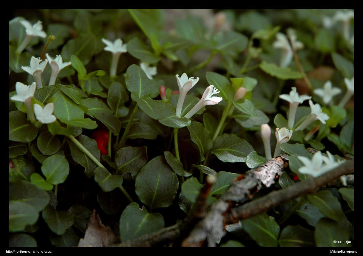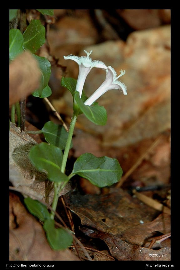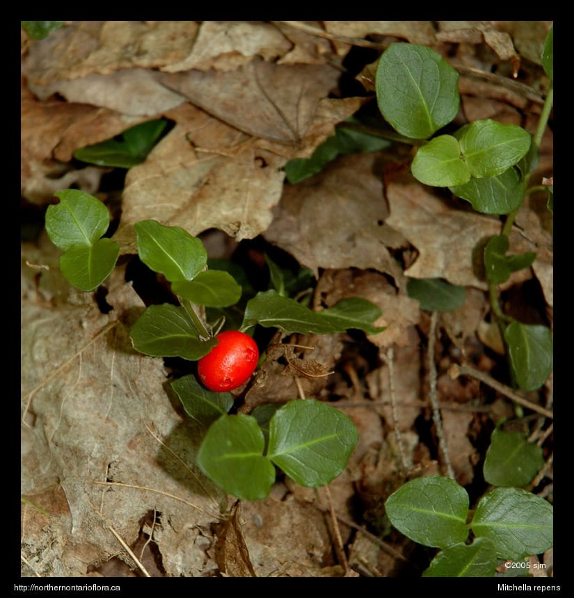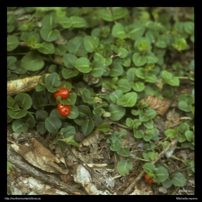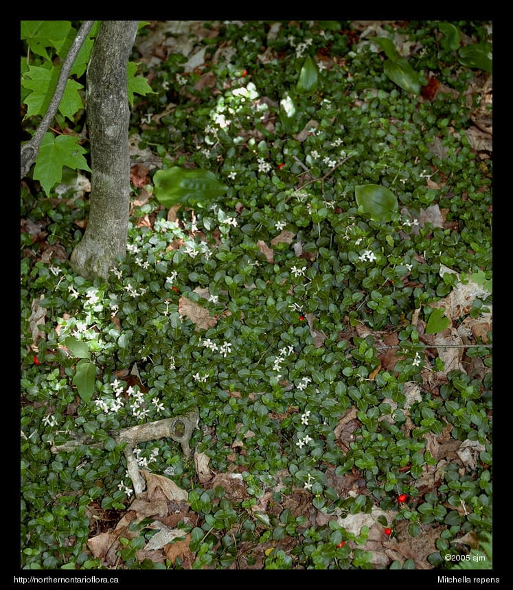 Habitat and Range: Dry to moist, rich deciduous and mixedwood forests. Mitchella repens is native to eastern North America; it extends as far north as the Batchawana area (Algoma District) in northern Ontario.
