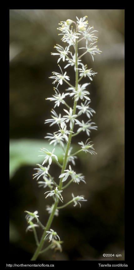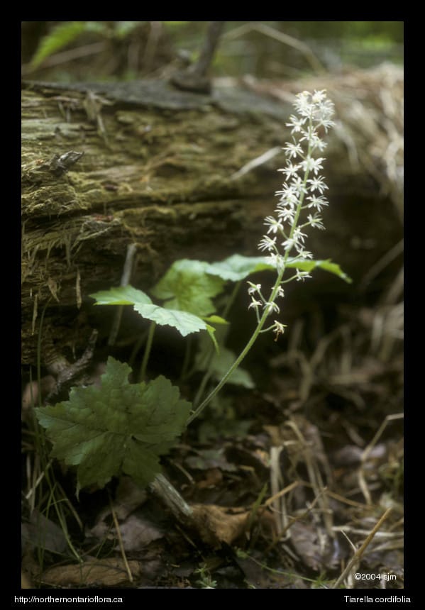 Similar Species: In southern Ontario, the basal leaves of Tiarella cordifolia may be confused with those of Mitella diphylla (two-leaved mitrewort) or Heuchera americana (alumroot), but the latter species do not extend into northern Ontario. These two species can be separated easily from Tiarella by the shape of their flowers.