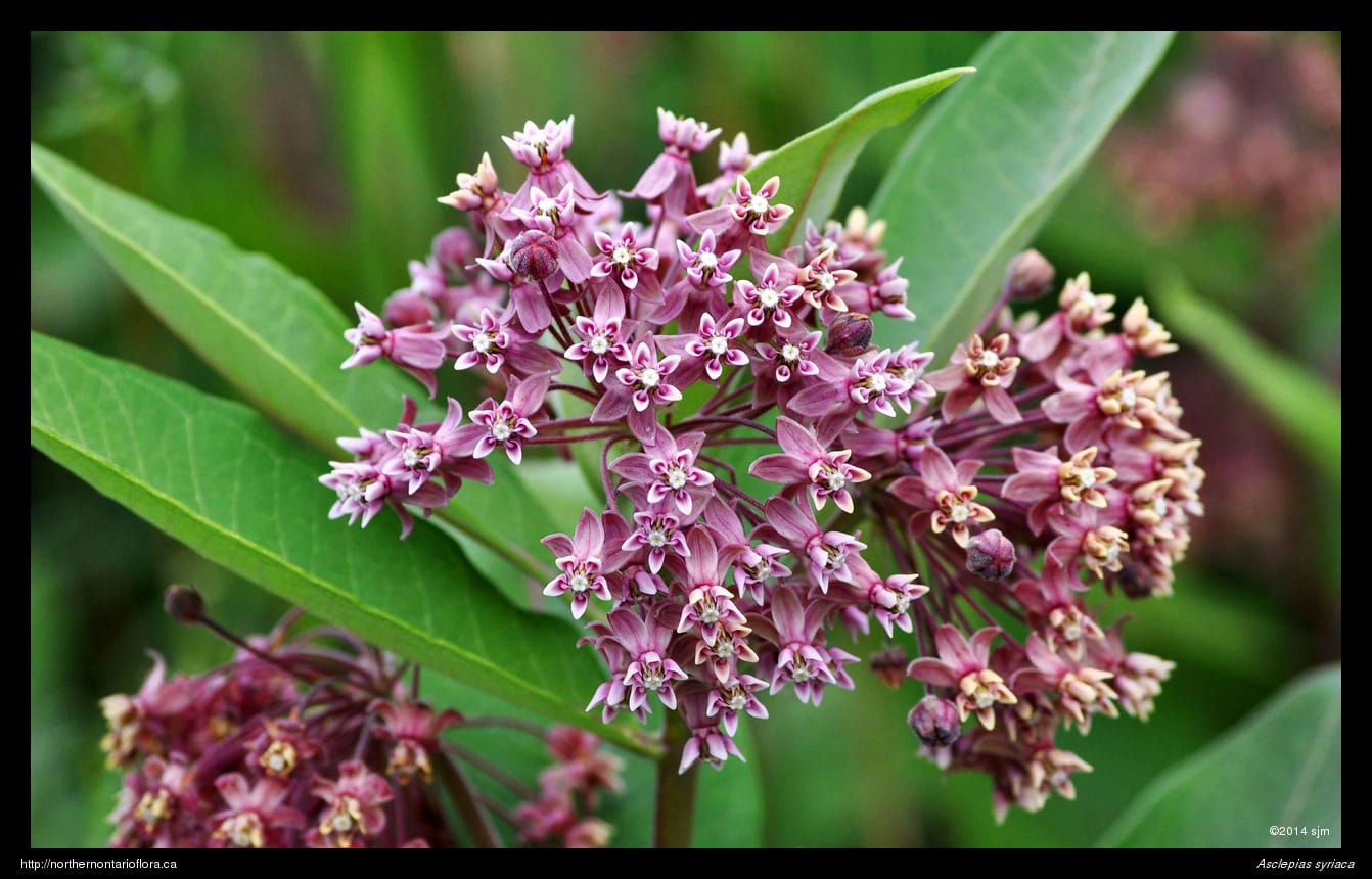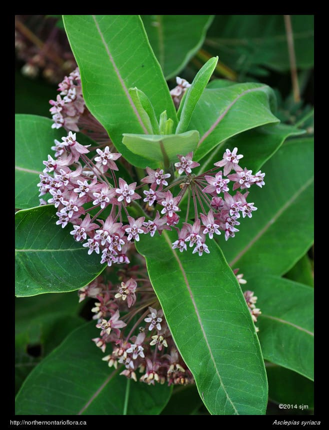 Similar Species: The only other milkweed species that occurs commonly in northern Ontario is swamp milkweed (Asclepias incarnata L.), which is easily identified by its narrower glabrous leaves, deep pink to reddish flowers, and narrower glabrous pods. As its name implies, swamp milkweed is found in wet habitats, particularly along stream or pond margins.