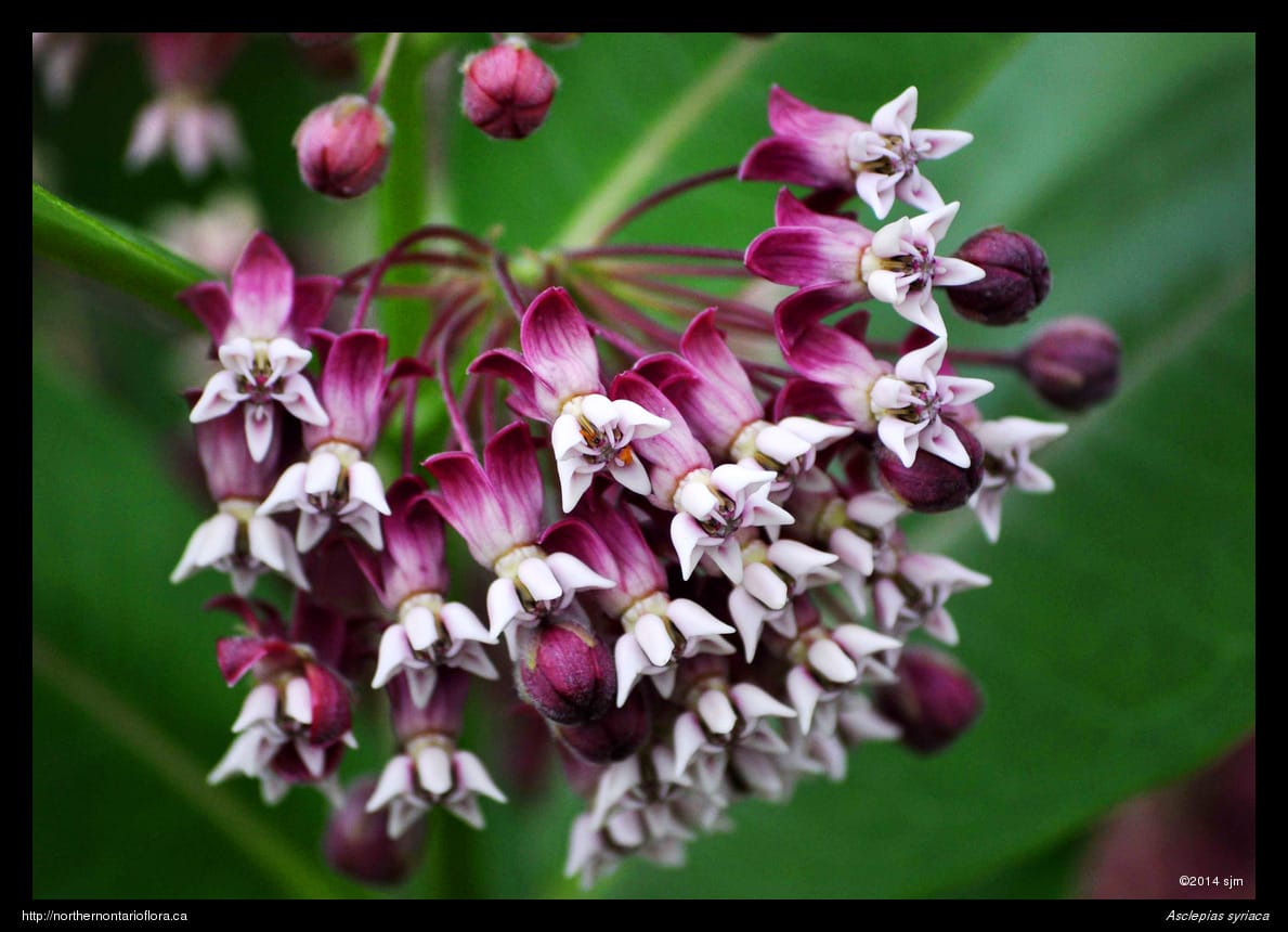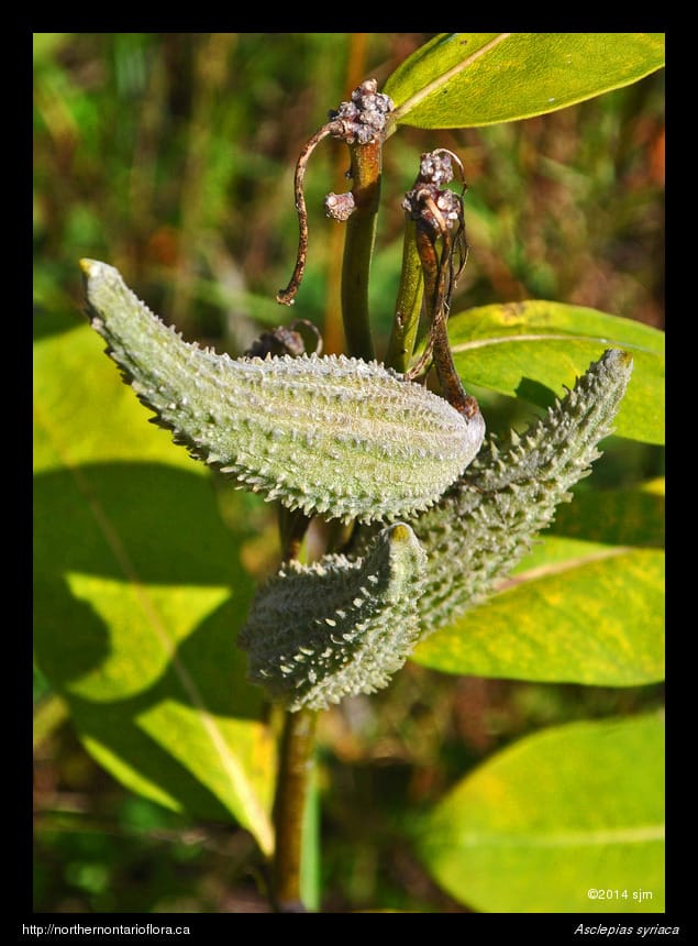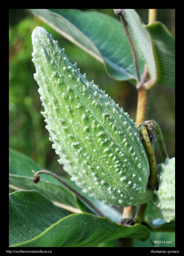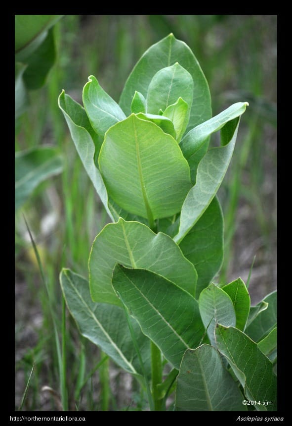 In northeastern Ontario, green milkweed (Asclepias viridiflora Raf.) has been collected only on the LaCloche Peninsula, near Manitoulin Island. Green milkweed grows on basic soils and can be recognized by its green flowers and narrow pods; its hairy leaves are similar to, but are narrower and more pointed at the apex, than those of common milkweed.