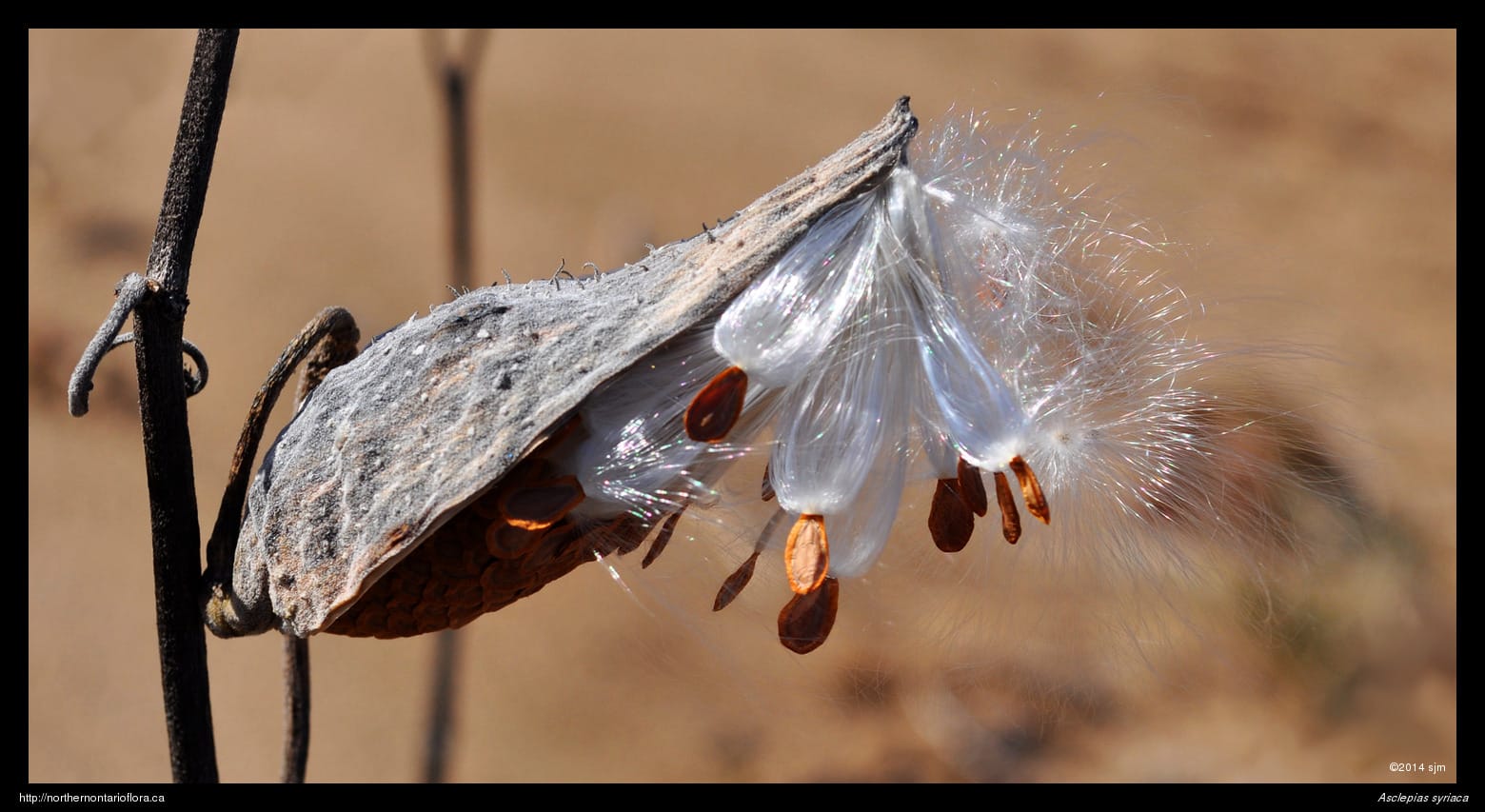 Fruit: The dry pods (follicles) are 7—10 cm long, narrowly ovoid, and taper to a blunt tip. Developing pods turn from green to brown; the downy surface is covered with vertical rows of soft spine-like bumps (protuberances). When mature, the pod splits open (dehisces) along one side to release numerous flat seeds, each bearing a tuft of long silky hairs (the coma) that aid in wind dispersal.