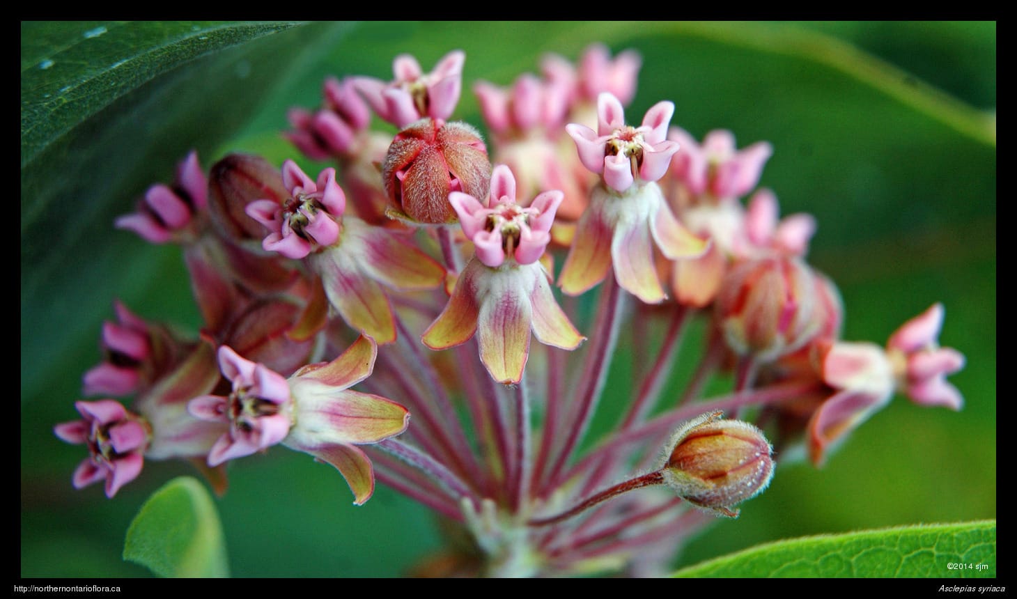 Flowers: Numerous fragrant flowers are arranged in large, spherical, axillary inflorescences (umbels); each flower is attached to the top of the main flower stalk (peduncle) by a thin downy pedicel. The greenish-tinged, pink, or purplish flowers have 5 narrow sepals and petals, 6—9 mm long, valvate in bud, reflexed in flower, and downy on the outer surface. The pistil has 2 superior ovaries that share a common style and stigma, form an enlarged stylar head that is surrounded by 5 highly modified stamens. The filaments of the stamens are fused together to form a fleshy star-shaped corona divided into 5 segments, each consisting of a hood, 3—4 mm tall, with an incurved horn emerging from within the hood and arching over the sylar head; nectar collects at the base of the corona. Each of the 5 anthers has 2 waxy pollen masses (pollinia). Pollination occurs when an insect accidentally pushes one of the pollinia into the stigmatic area of the flower while sipping nectar.