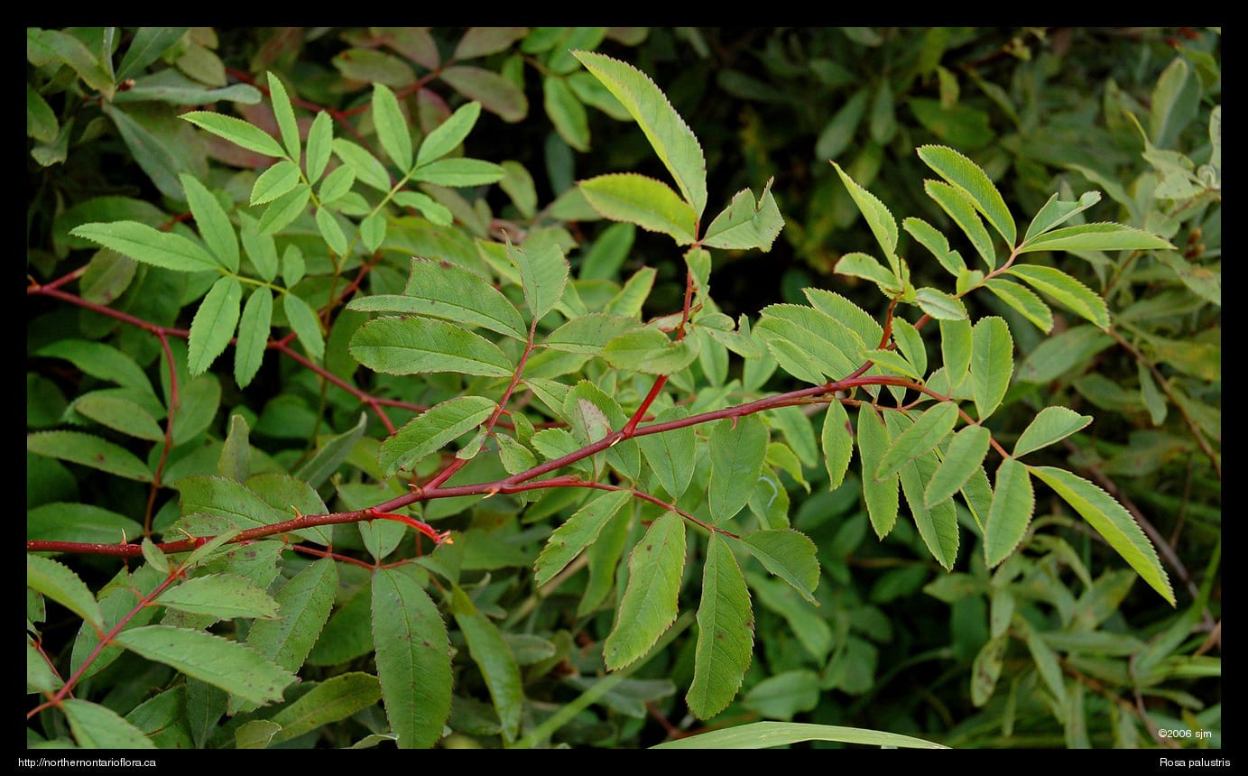 Habitat and Range: Marshes, swamps, and shorelines. The swamp rose is native to eastern North America, with a range extending west from Nova Scotia to the eastern shores of Lake Superior. It has the most restricted range of the three most common rose species (Rosa acicularis, R. blanda, and R. palustris) in northern Ontario. While the swamp rose is found throughout southern and eastern Ontario, in northern Ontario it occurs only in the southern portions of Algoma District, extending northeast to Lake Timagami, around 47° N (Soper and Heimburger 1982).