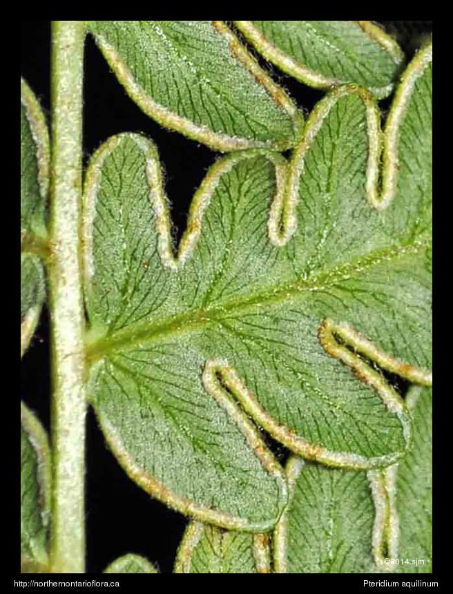 Reproductive structures/fertile fronds: Bracken ferns are monomorphic, with similar fertile and sterile fronds. Sporangia develop along the edges of the lower frond surface (in marginal sori); margins of the fertile pinnules fold over the sporangia, forming a false indusium along the margin. Fertile colonies are usually found on disturbed sites and occur less commonly in the north than in southern portions of their range.