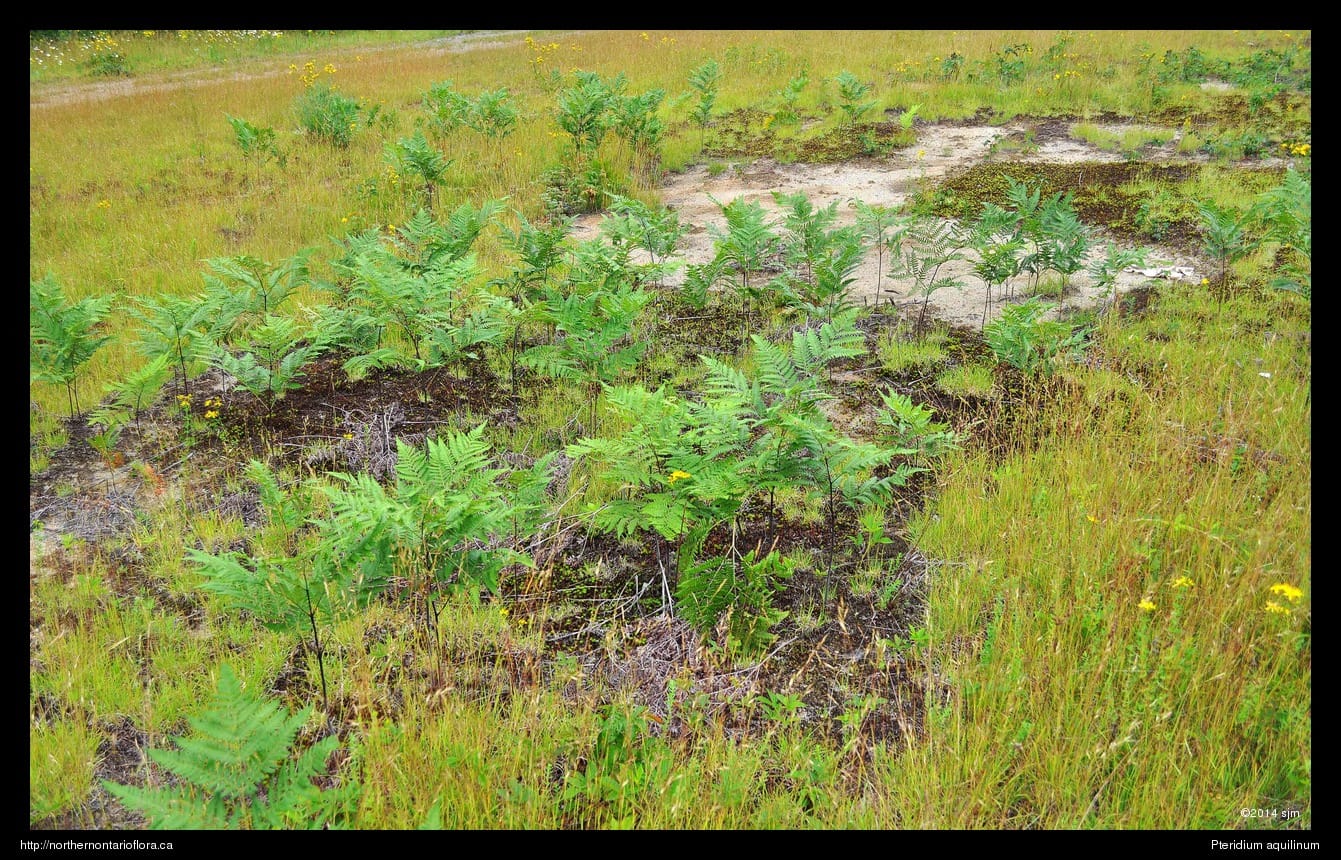 Habitat and Range: Clearings, roadsides, old burns, forest edges, and open woodlands; usually on dry, acidic, sandy, or sterile soils. The eastern variety of bracken fern (var. latiusculum) has a Canadian range that extends from Newfoundland and southern Quebec west to southeastern Manitoba; a few disjunct locations are reported from British Columbia and southern Alberta.