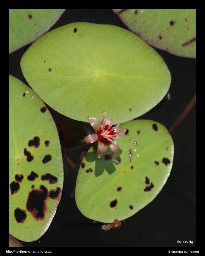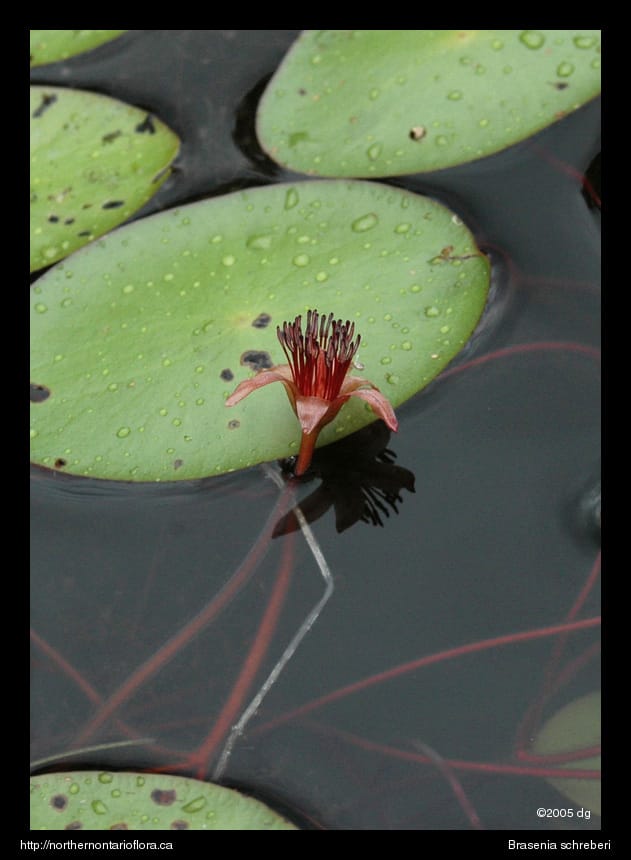 Flowers: Bisexual; solitary and terminal, to 2 cm across, borne at or just above the water surface; tepals 6, dull red to purple, lanceolate to narrowly ovate, to 1.6 cm long, recurved. Stamens 12-36; pistils 4-18, stigmas linear, ovary superior. Water shield is protogynous, which means that the pistils are receptive and mature before the stamens begin to expand. Blooming from July through September.
