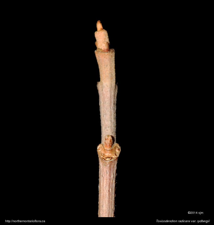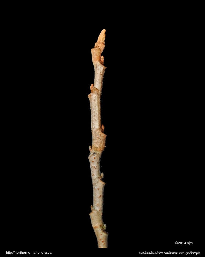 Click on a thumbnail below to see larger image.General: An erect deciduous shrub, up to 1 m tall, but usually shorter (2-6 dm) in northern Ontario; spreading by rhizomes and often forming large patches or colonies. Twigs are light brown with blunt (obtuse) to pointed (acute), slightly pubescent, naked buds. Aerial roots are lacking. Like all Toxicodendron species, western poison ivy will cause a blistering rash in sensitive people. The specific cause of the rash is urushiol, a resinous oil that causes contact dermatitis. Other plants in the Anacardiaceae that contain urushiol include cashews, pistachios, and mangoes; each of these may cause problems when ingested by people hypersensitive to poison ivy.