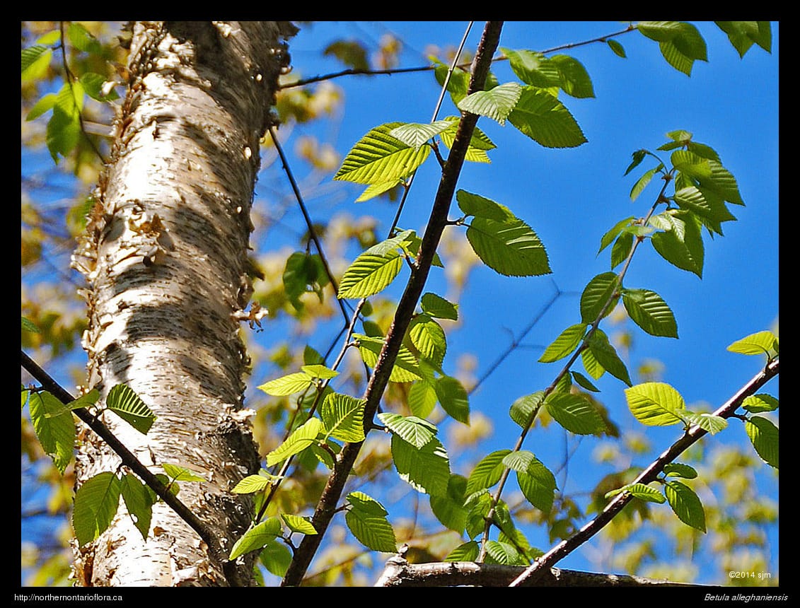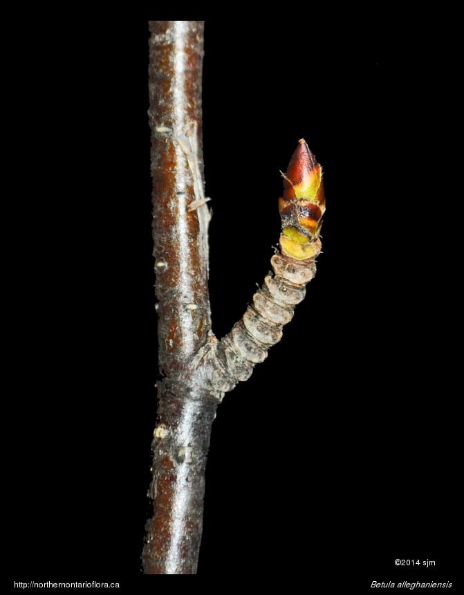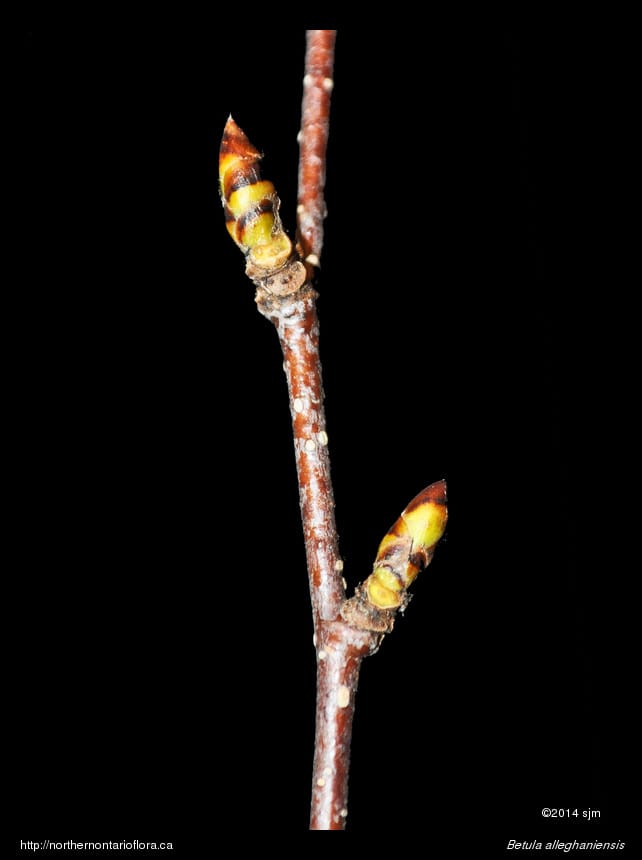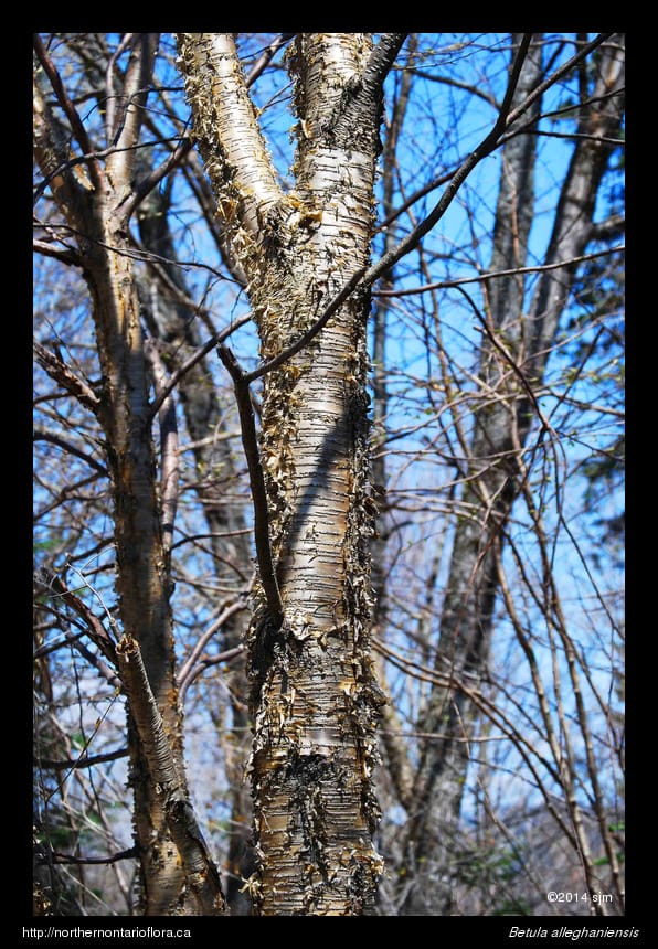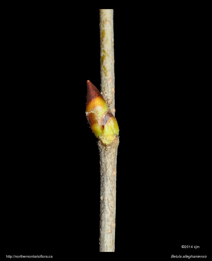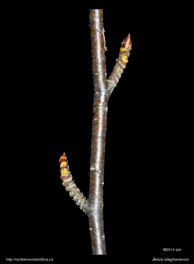 Click on a thumbnail below to see larger image.General: A medium to large hardwood tree, to 25-30 m tall, with large spreading branches. Bark reddish-brown when young, pale yellow to silvery-gray or bronze when mature and peeling (exfoliating) in thin papery curls. Twigs slender, brownish, slightly hairy (pubescent), and with the flavour of wintergreen when chewed. Terminal bud lacking on long twigs; lateral buds pointed, often pubescent, with 3 two-toned brownish scales. Short spur shoots have terminal buds with 5-7 scales.