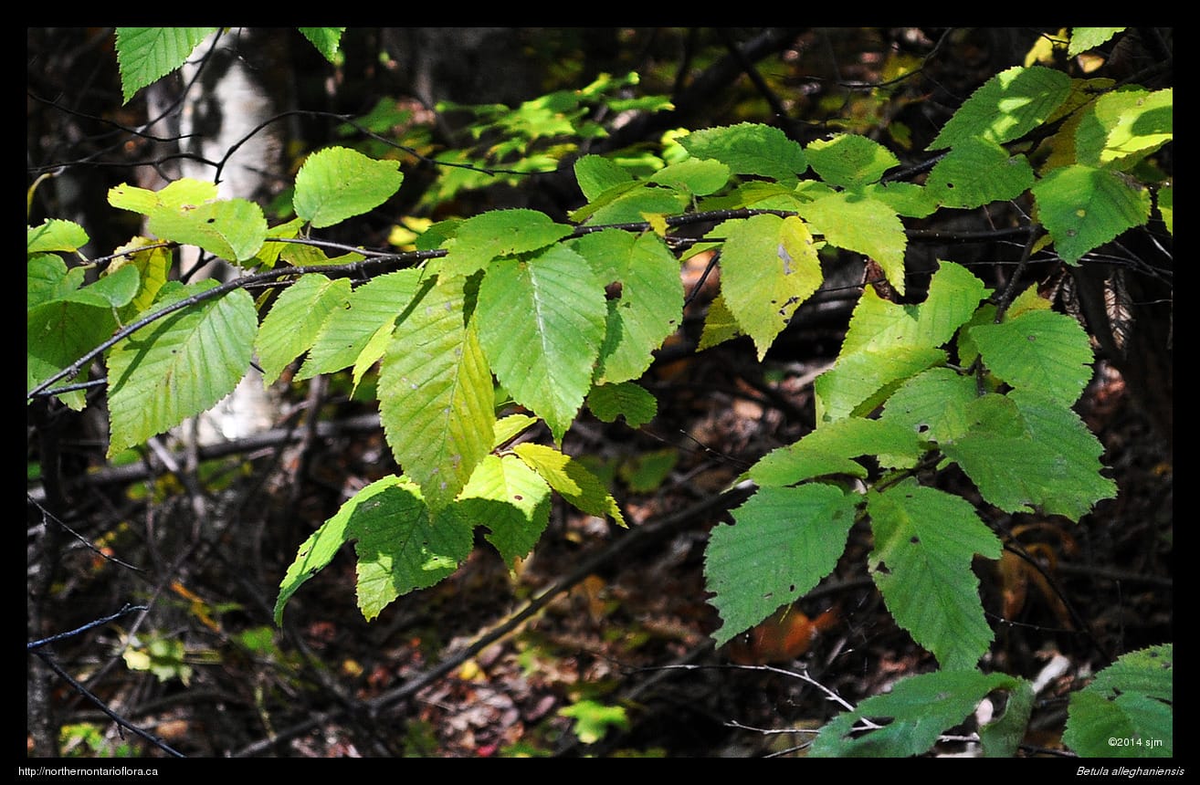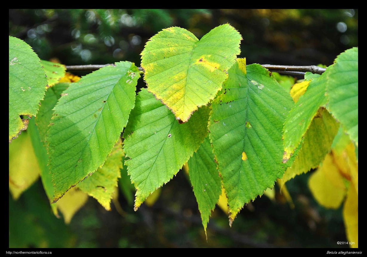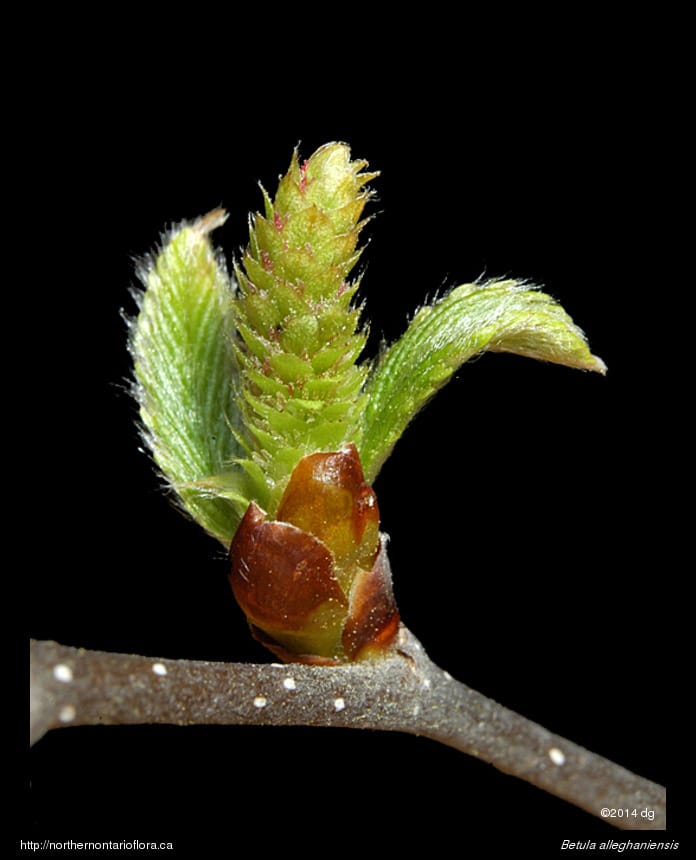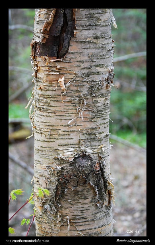 Click on a thumbnail below to see larger image.General: A medium to large hardwood tree, to 25-30 m tall, with large spreading branches. Bark reddish-brown when young, pale yellow to silvery-gray or bronze when mature and peeling (exfoliating) in thin papery curls. Twigs slender, brownish, slightly hairy (pubescent), and with the flavour of wintergreen when chewed. Terminal bud lacking on long twigs; lateral buds pointed, often pubescent, with 3 two-toned brownish scales. Short spur shoots have terminal buds with 5-7 scales.
