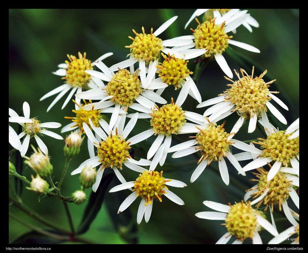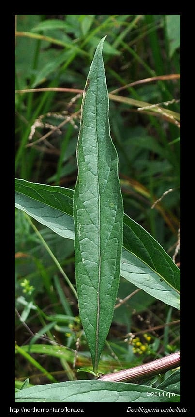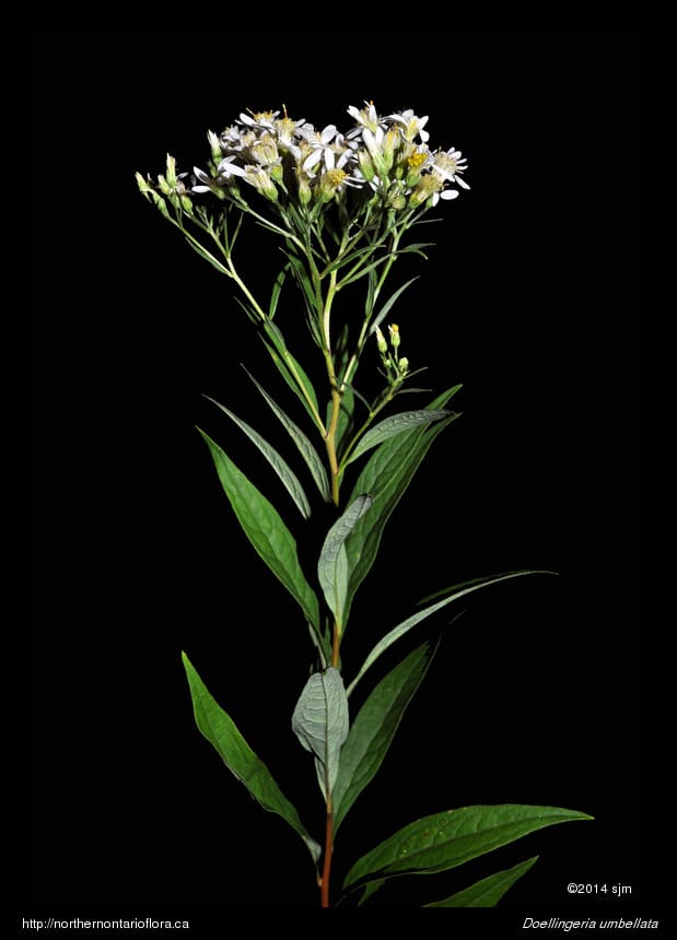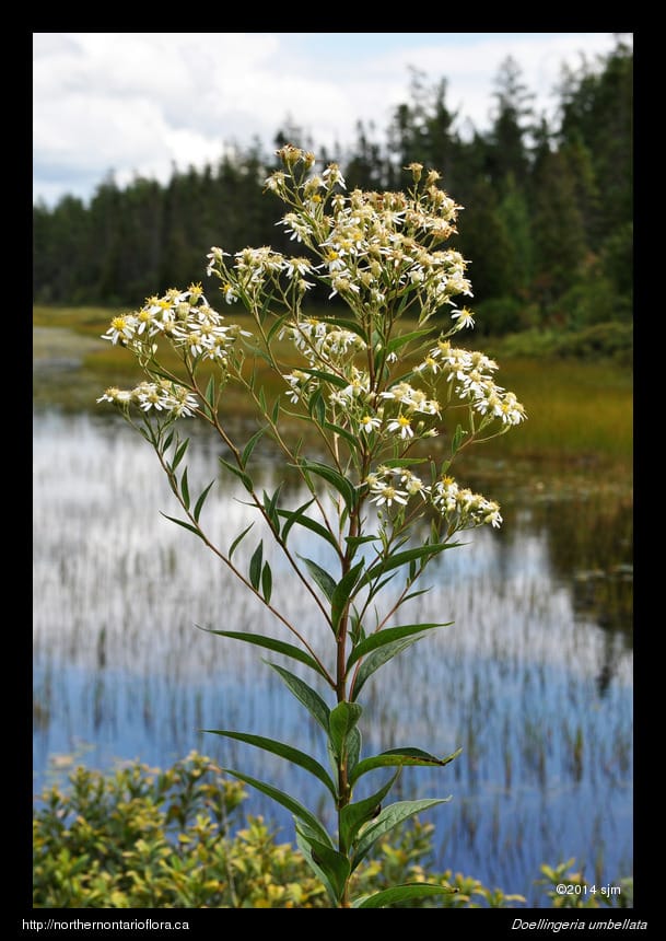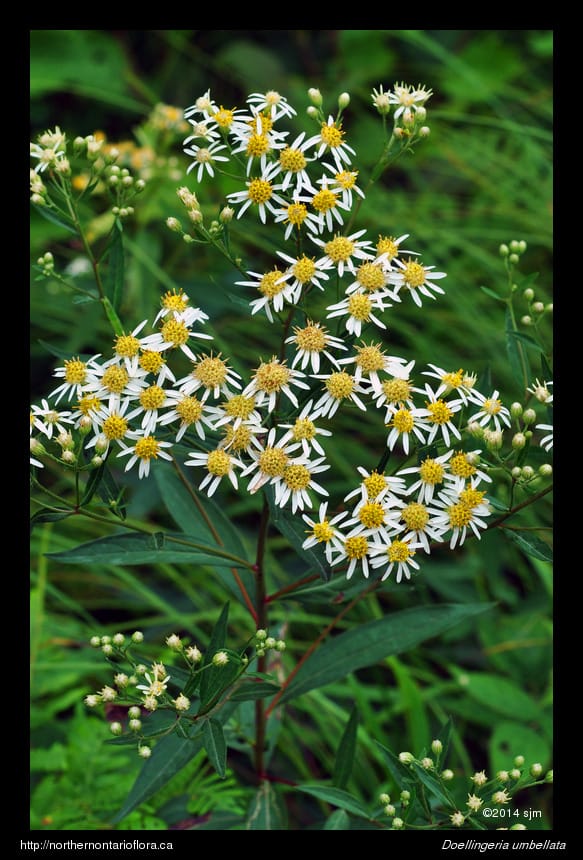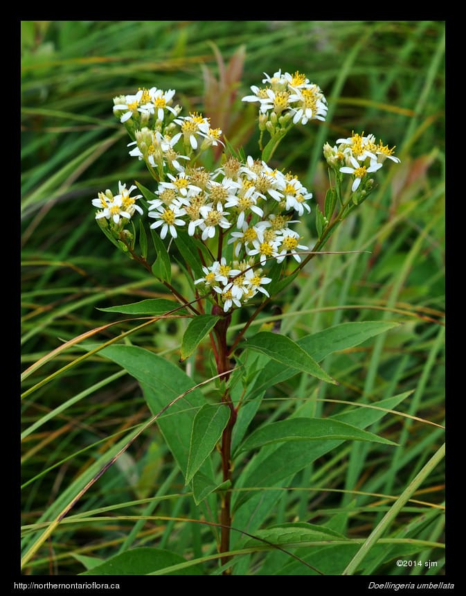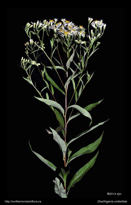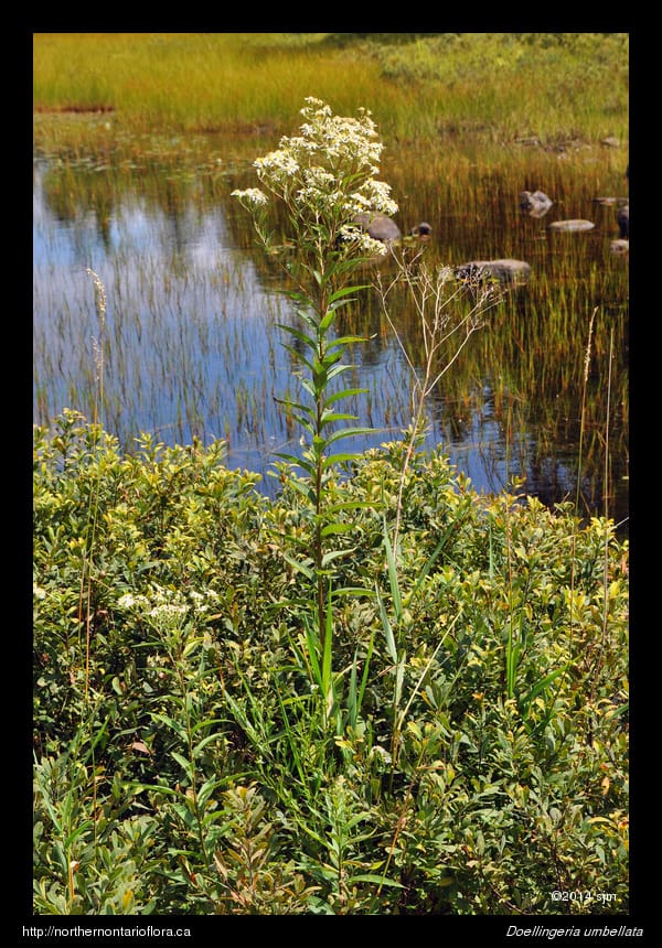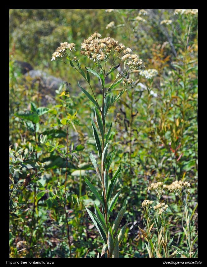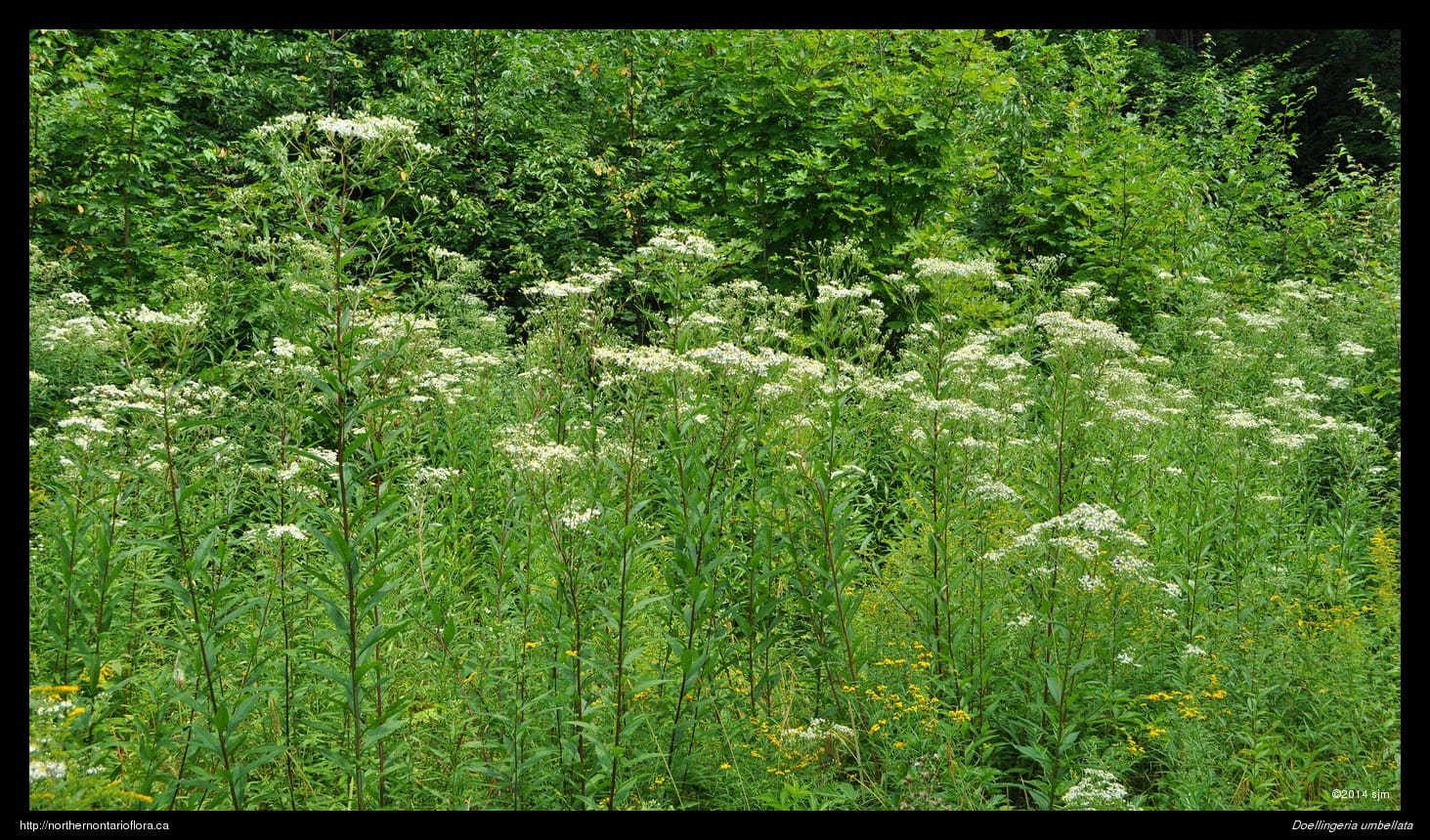 Habitat and Range: Moist to somewhat moist soils in fields, clearings, rights-of-way, thickets, forest margins, and roadsides. Flattop white aster is a temperate North American species whose range extends from Newfoundland to Alberta. It is found throughout the Algoma District and most of Ontario. Doellingeria umbellata var. pubens has a Canadian range that extends from Quebec to Alberta, while the typical var. umbellata can be found from insular Newfoundland west to central Ontario.