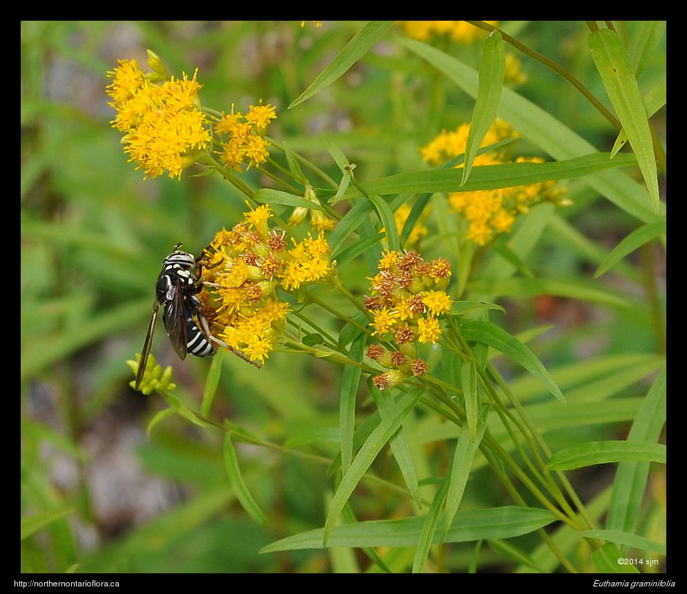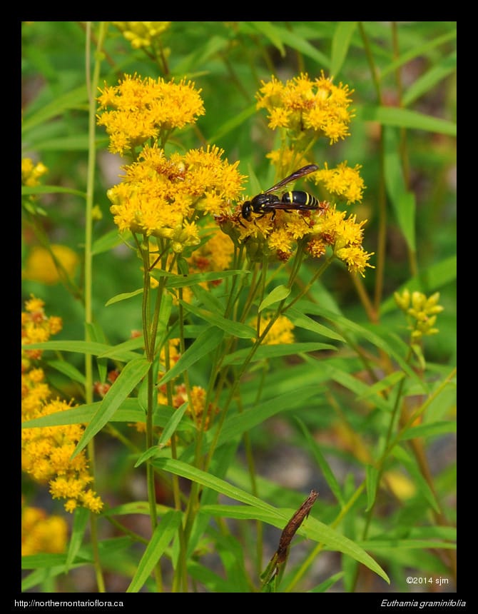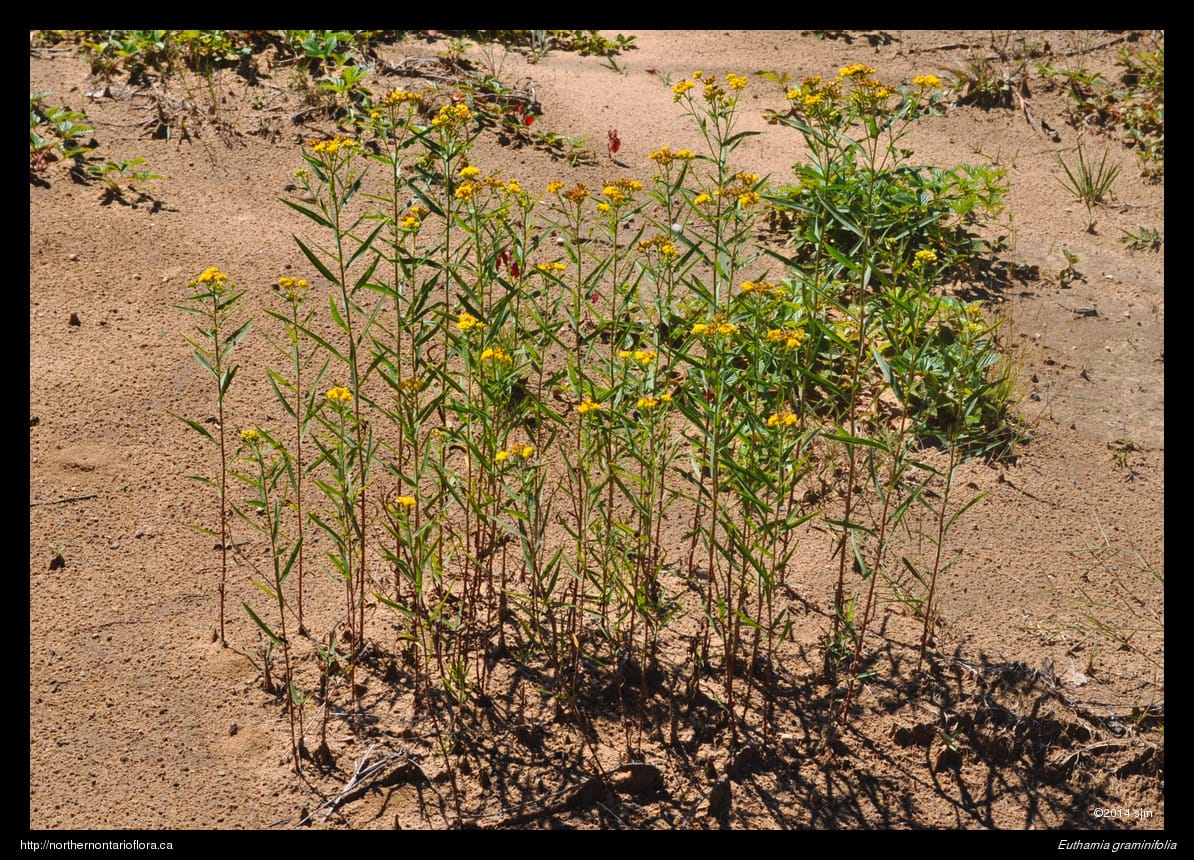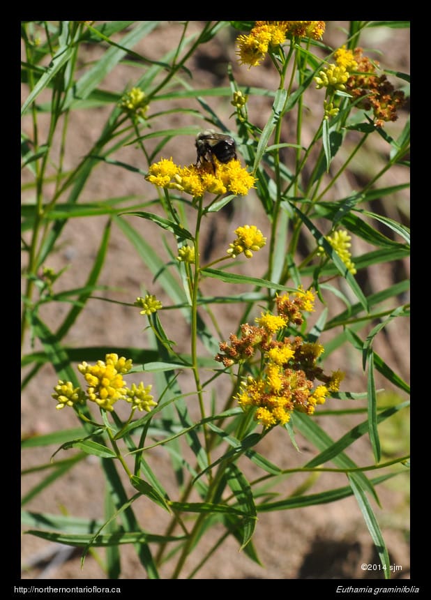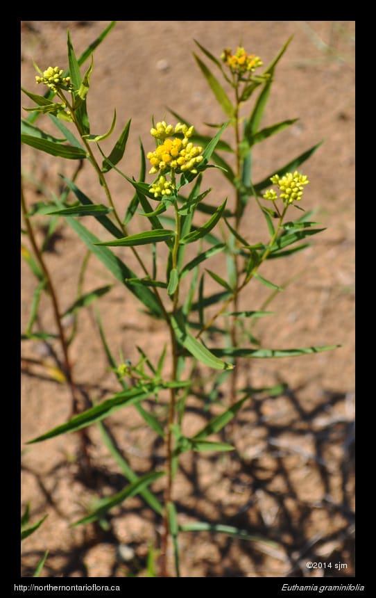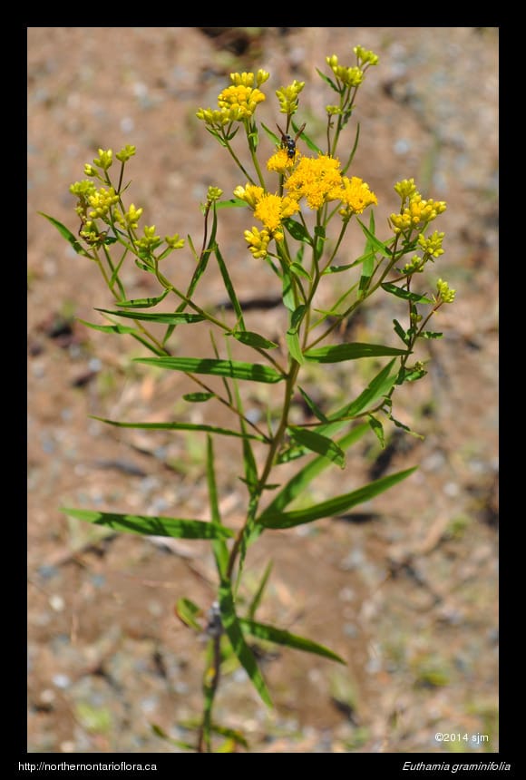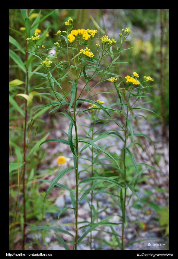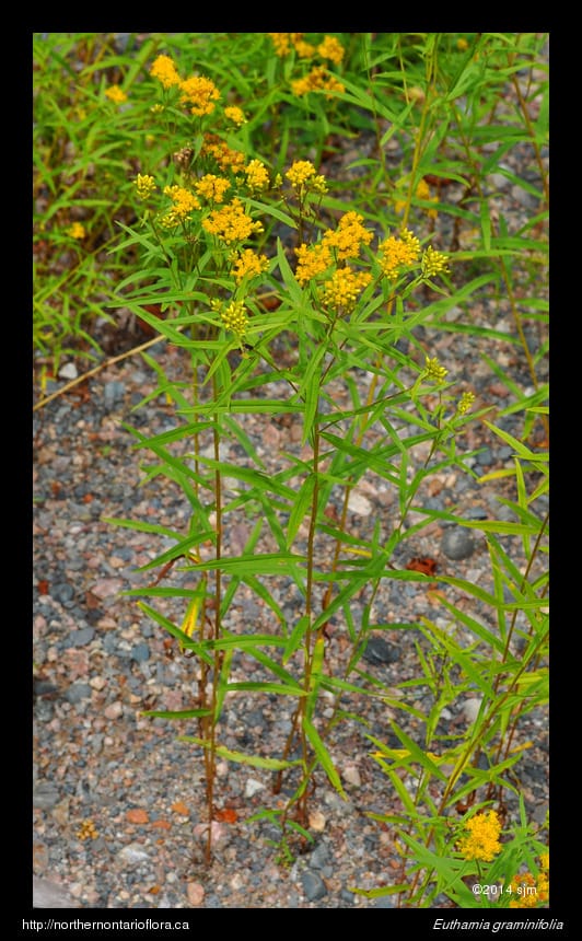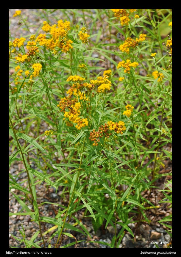 Click on a thumbnail below to see larger image.General: An erect perennial, 3—15 dm tall, spreading by creeping rhizomes. Stems are smooth (glabrous) or bear vertical lines of fine hairs, and branch in the upper ¼ of the plant. The typical variety (var. graminifolia) of grassleaf goldenrod is the only variety found in Canada.