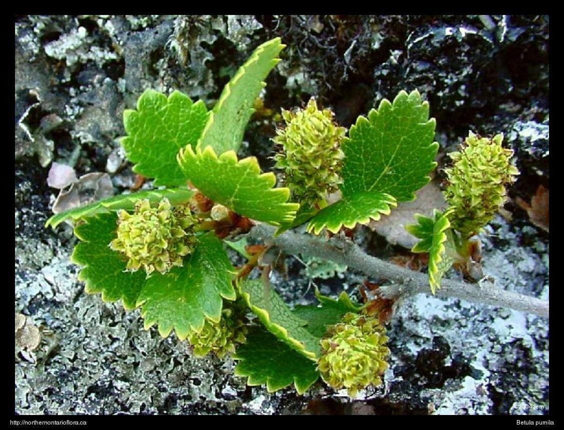 Similar Species: The dwarf resin birch, Betula glandulosa, a more arctic species, also has small obovate to nearly orbicular leaves, but the leaves of B. glandulosa are rarely longer than 1–2 cm long and their glabrous twigs bear large, resinous glands that give the twigs a warty appearance. In Ontario, Betula glandulosa is restricted to the Hudson Bay Lowlands, where it can hybridize with Betula pumila, forming Betula xsargentii.