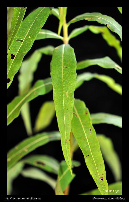 Similar Species: Fireweed leaves are similar in shape to those of several willow (Salix) species, but willows have woody stems, small catkin-like flowers, and small ovoid or pear-shaped (pyriform) capsules. Fireweed leaves are also similar to several aster or goldenrod species when young, but the secondary veins of fireweed leaves are very numerous, close together, and oriented nearly perpendicular to the midrib, especially in the lower half of the leaf.