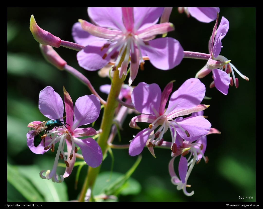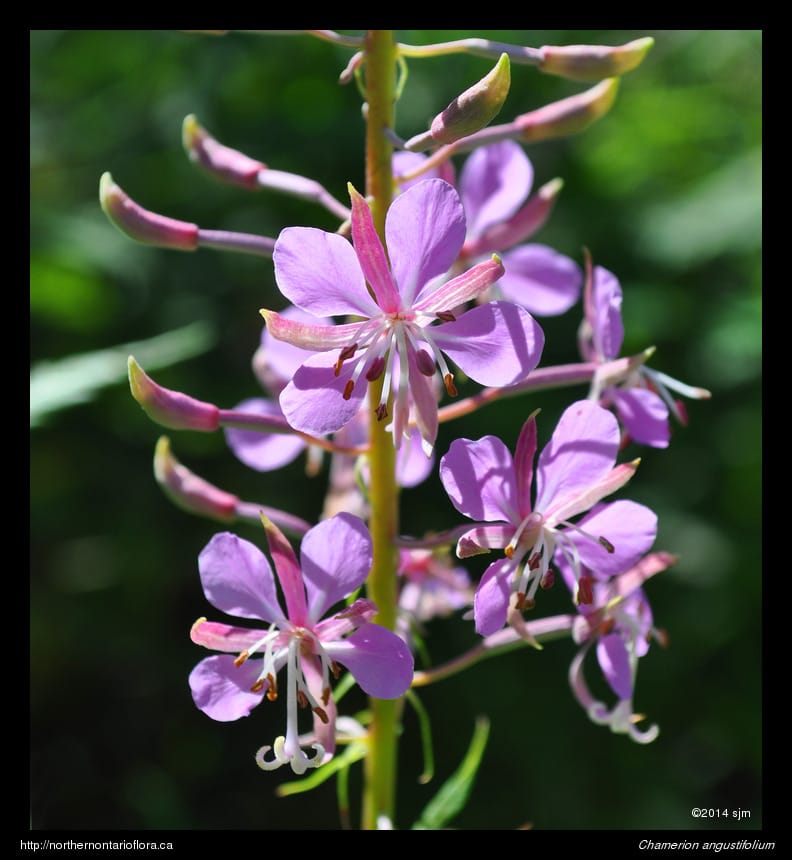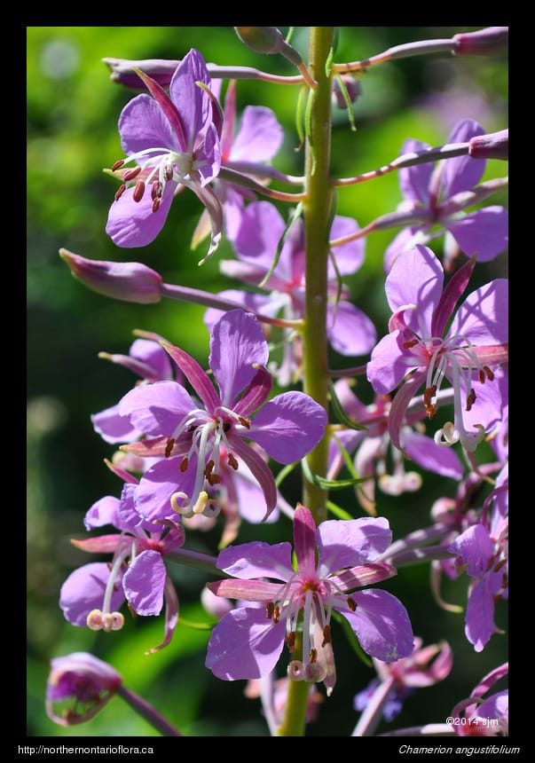 Flowers: Numerous flowers are borne in elongate terminal inflorescences (racemes), to 7.5 dm long. Flowers bloom from the base upward, buds are pendant, but flowers are held at about right angles to the stem. Flowers are about 4 cm wide and have 4 narrowly lanceolate to oblanceolate calyx lobes, each 8—12 mm long, and 4 ovate to obovate rose to light purple (rarely white) petals, each 8—20 mm long. Stamens are 8, with white filaments and purplish anthers; the single pistil is composed of a finely hairy inferior ovary, with a 1—2 cm long style that extends beyond the stamens. The stigma has 4 pale branches that are held together and face forward when the flower first opens. As the flower matures, the stigma lobes spread outward into a cross-shaped pattern, then coil backward as the flowers fade. Fireweed flowers are insect pollinated.